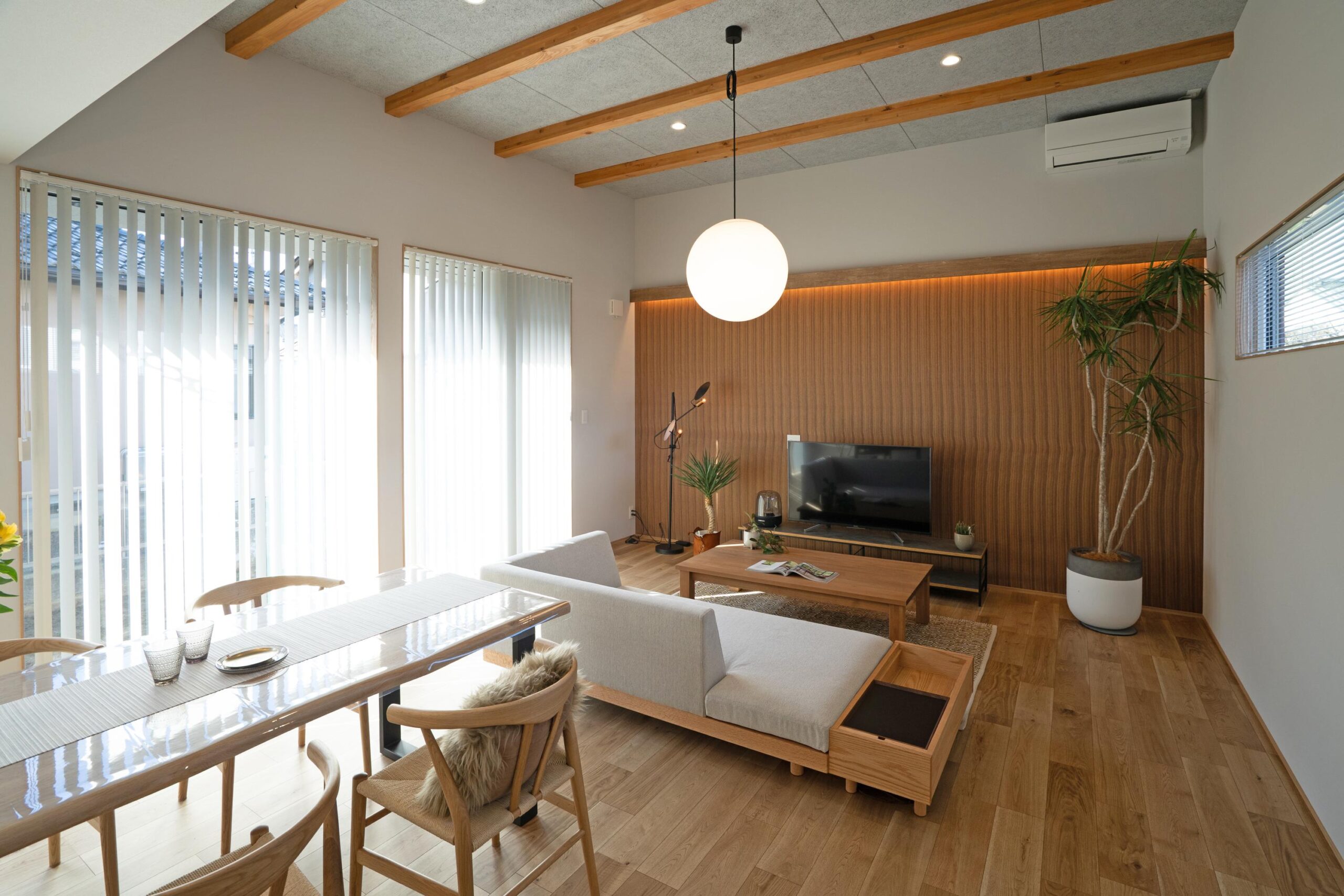 天井高を活かした大空間LDKは、床を明るく、天井のトーンを抑えることで、落ち着きと広がりを演出しました。テレビ背面にはチークの突板をあしらい、上部の間接照明が夜の寛ぎを優雅に演出します。