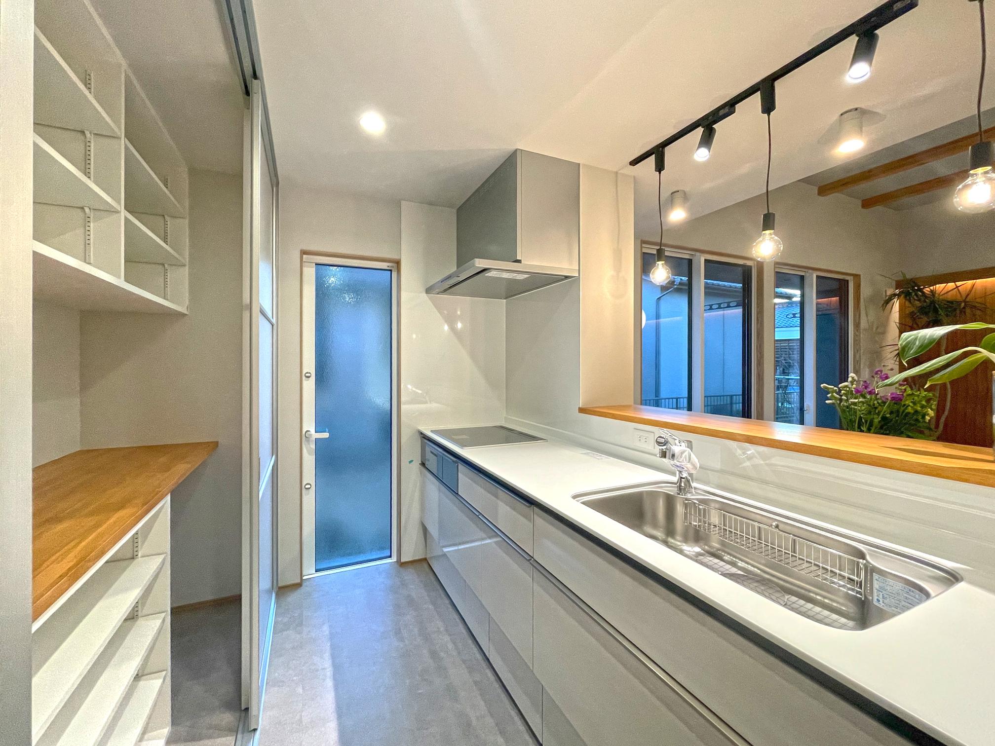 お料理がご趣味の奥様がこだわったのは、充実の背面収納。調理家電やこだわりの食器をたっぷり収めつつ、扉一枚で「全部隠せる」設計に。コンセントの位置まで計算し尽くされた使い勝手の良さは、キッチンにこだわりたい方必見です。