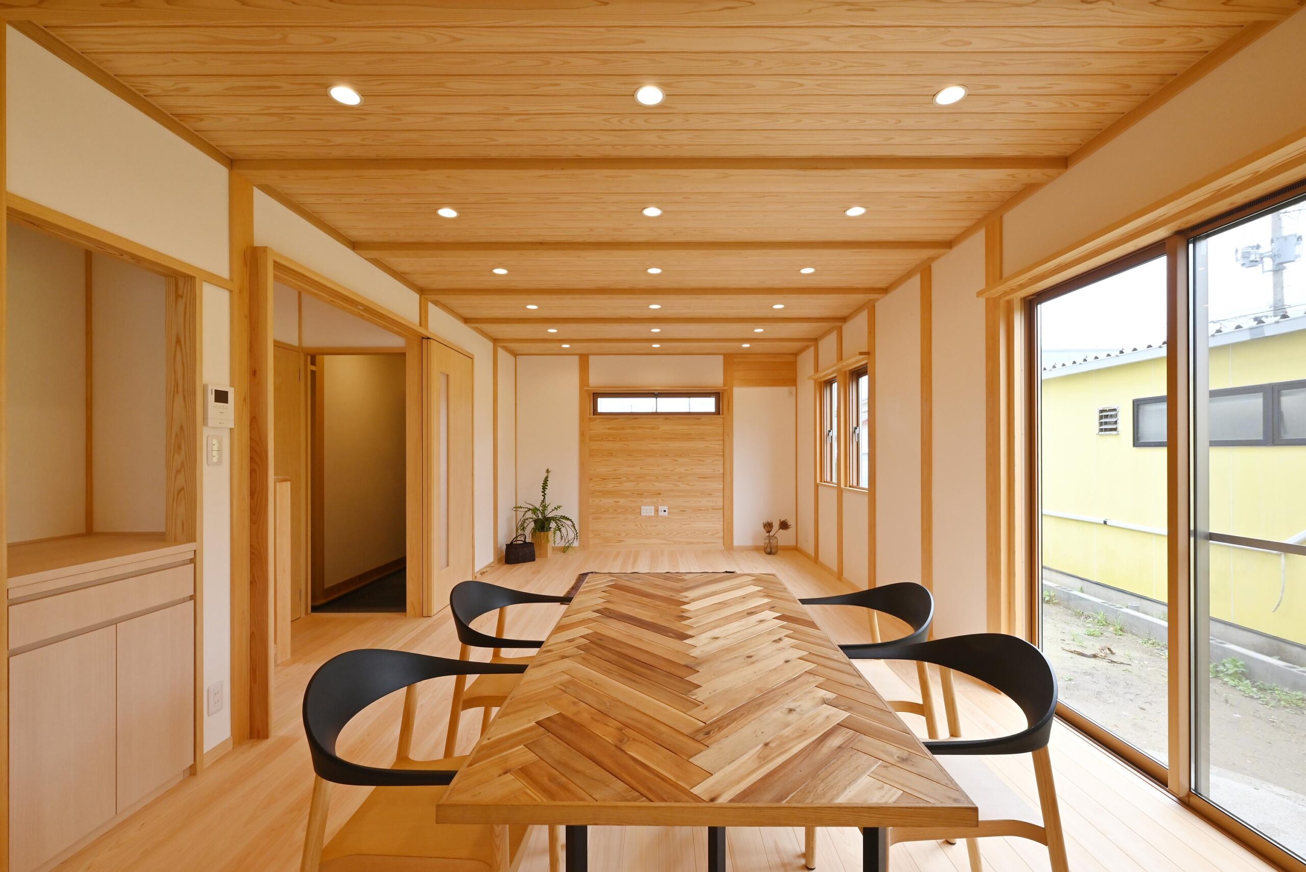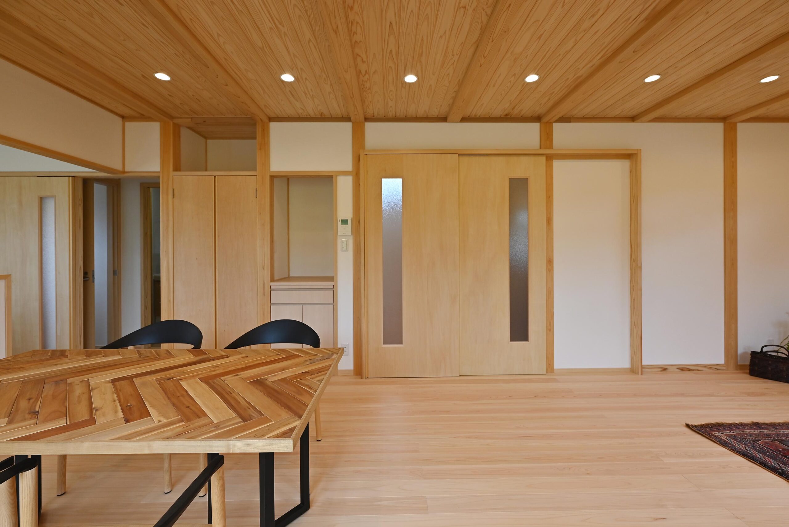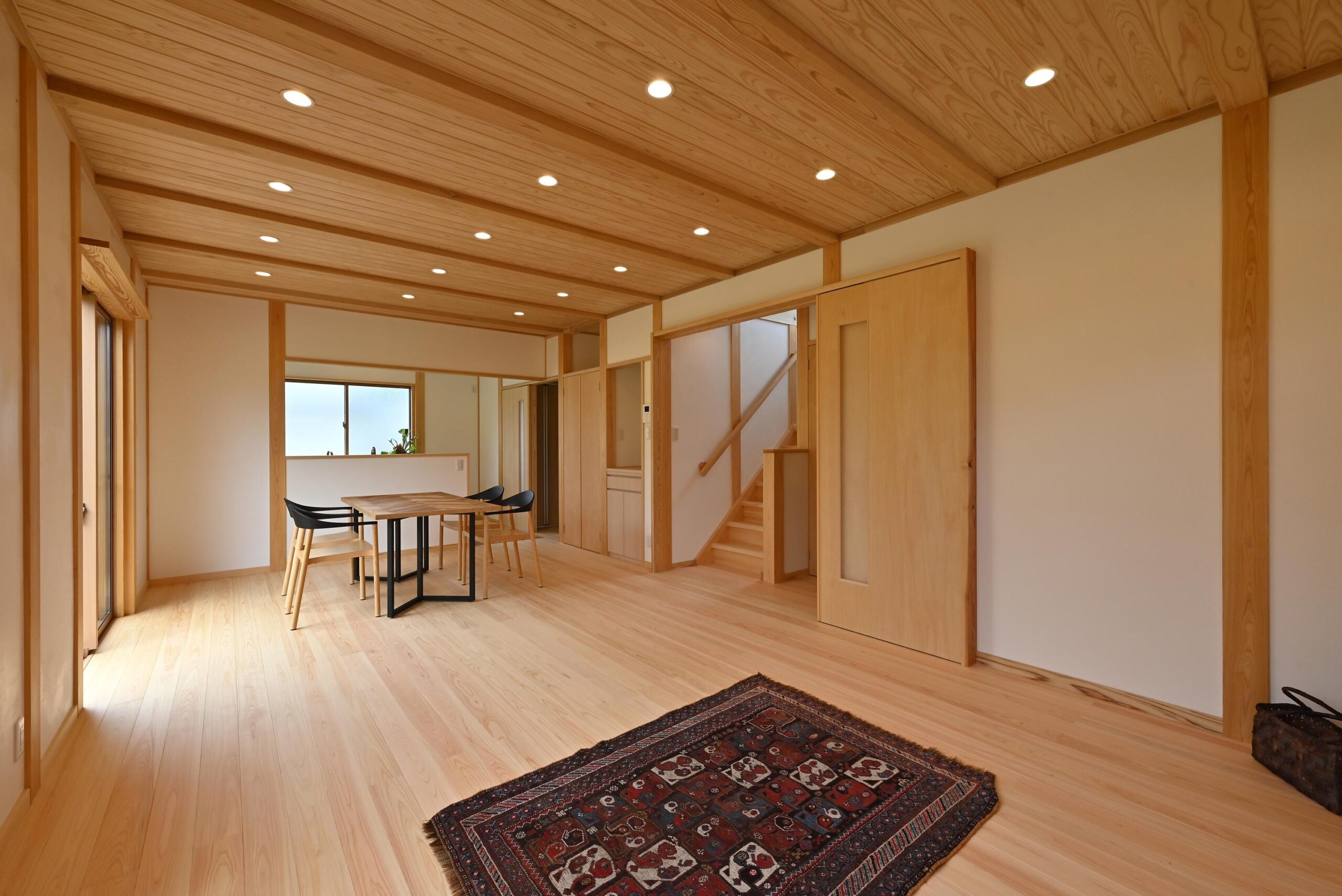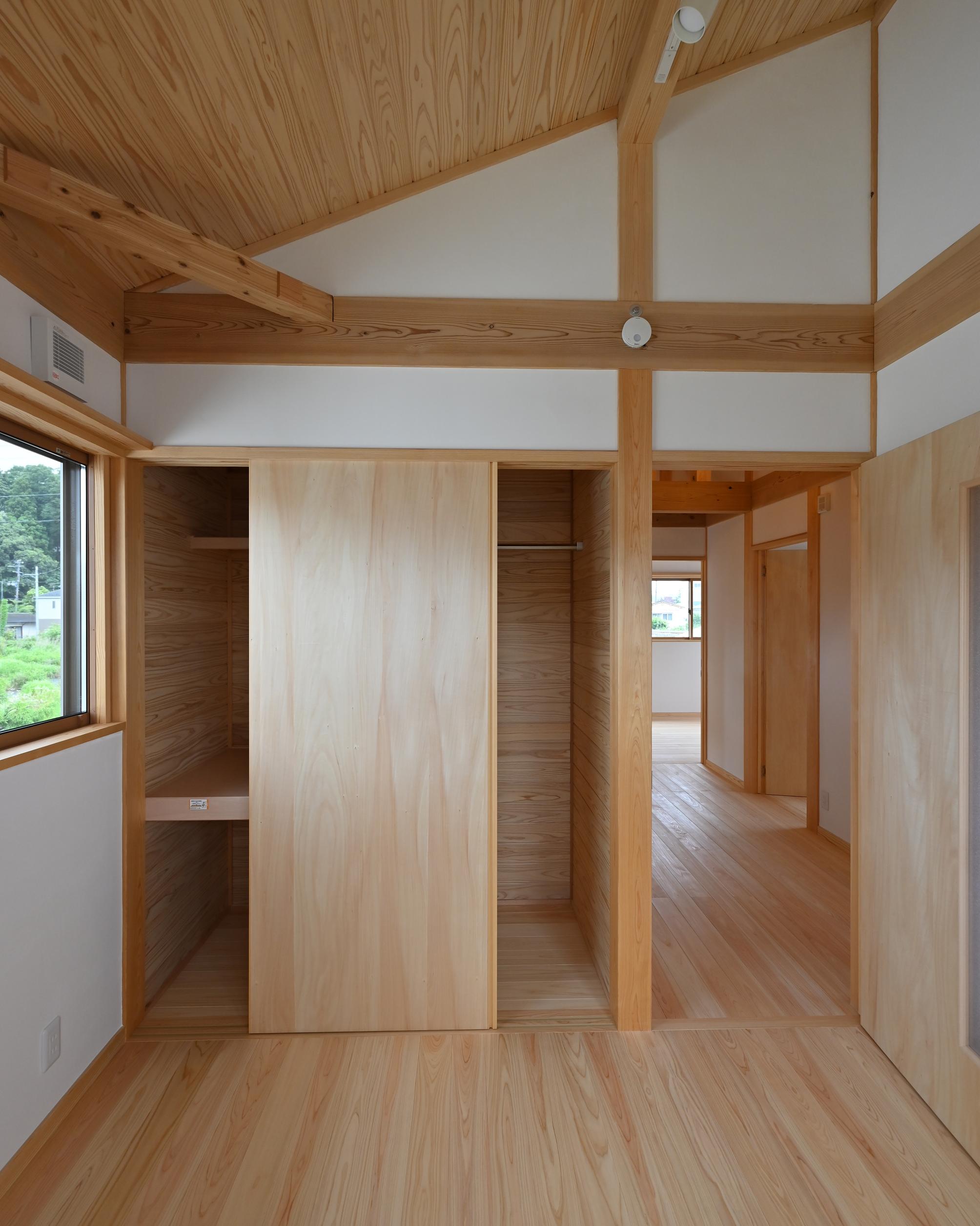 桧の柱、杉の梁、桧の無垢フローリング、杉羽目板の天井、漆喰の壁。自然素材が織りなす空間。清々しい空気が流れています。