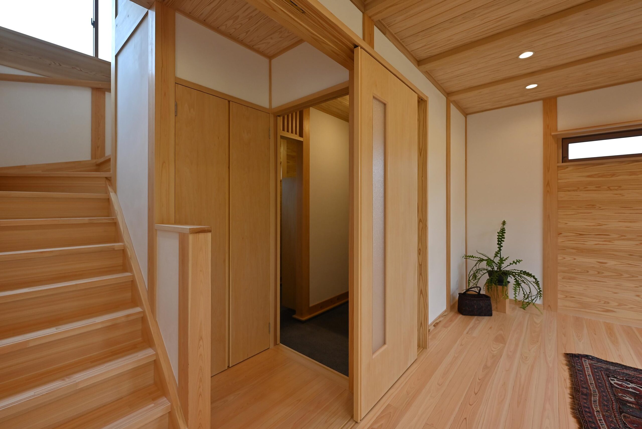 玄関を入ると和モダンと自然素材の空間へ。
