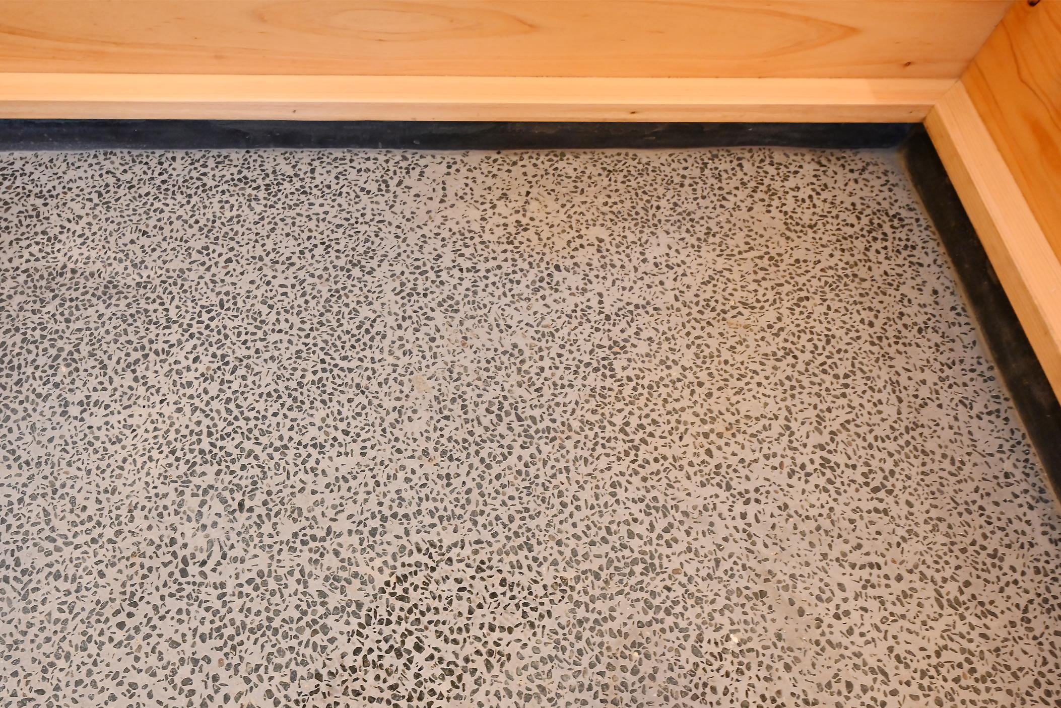 土間は洗い出し仕上げ。「洗い出し」は小石を混ぜたモルタルの表面を水で洗い出して、石の表面を露出させる仕上げです。