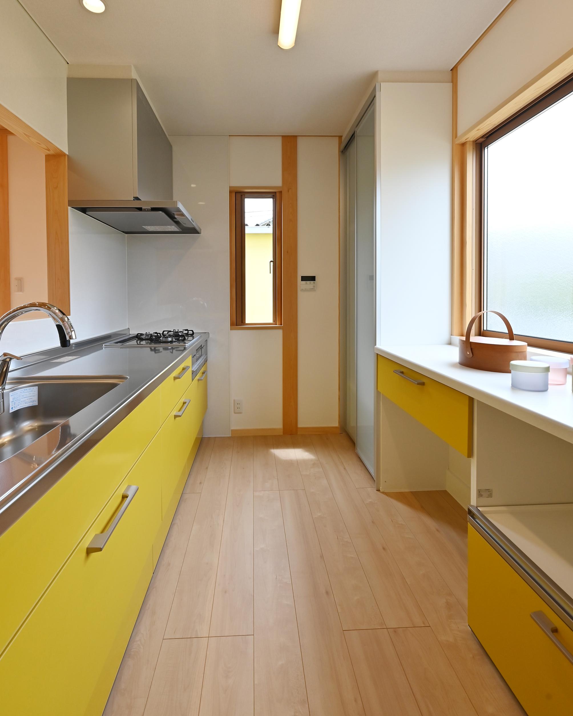 キッチンは元気の出る明るい黄色をチョイス。パントリーまで同じ色でそろえて統一感を大切に。
