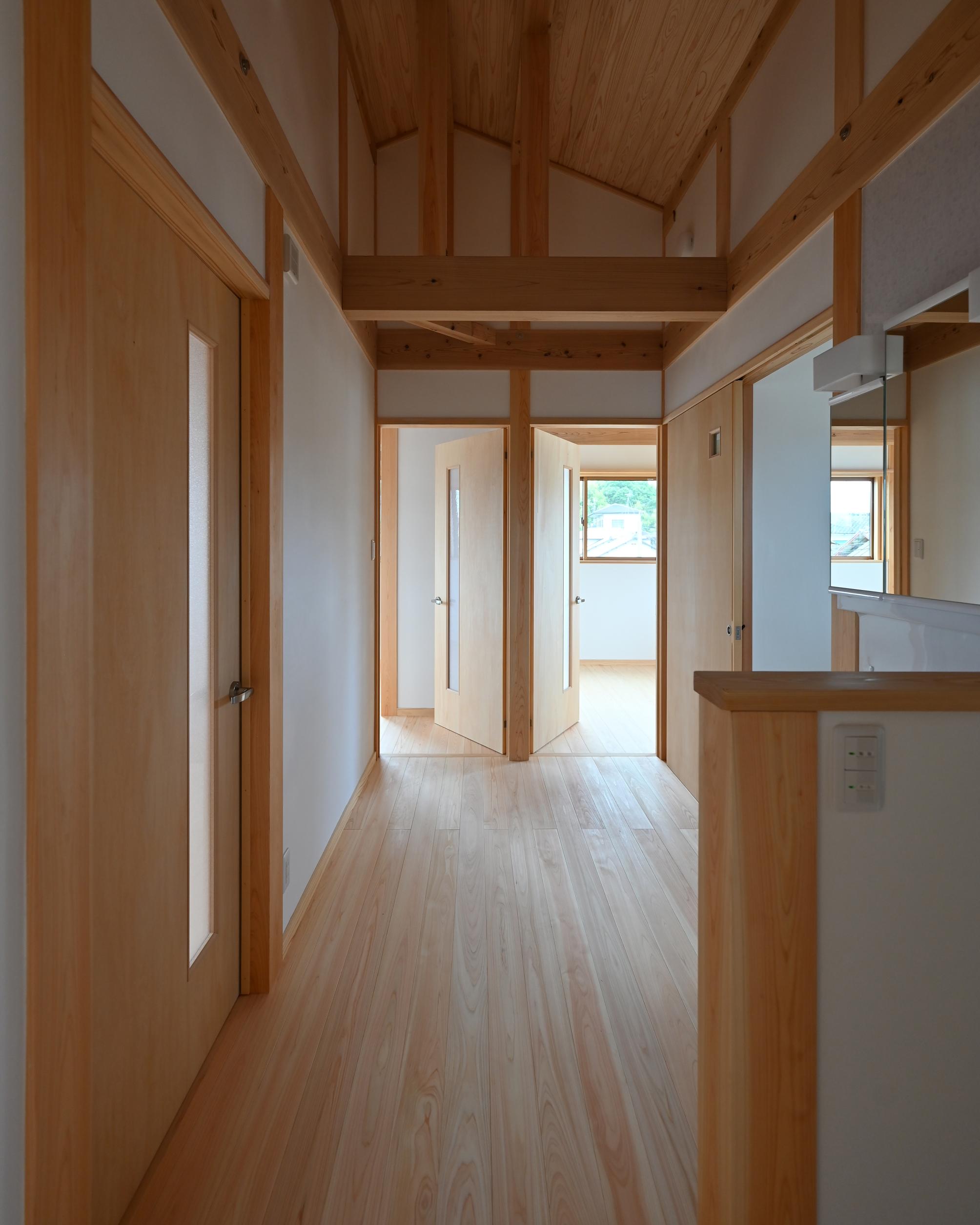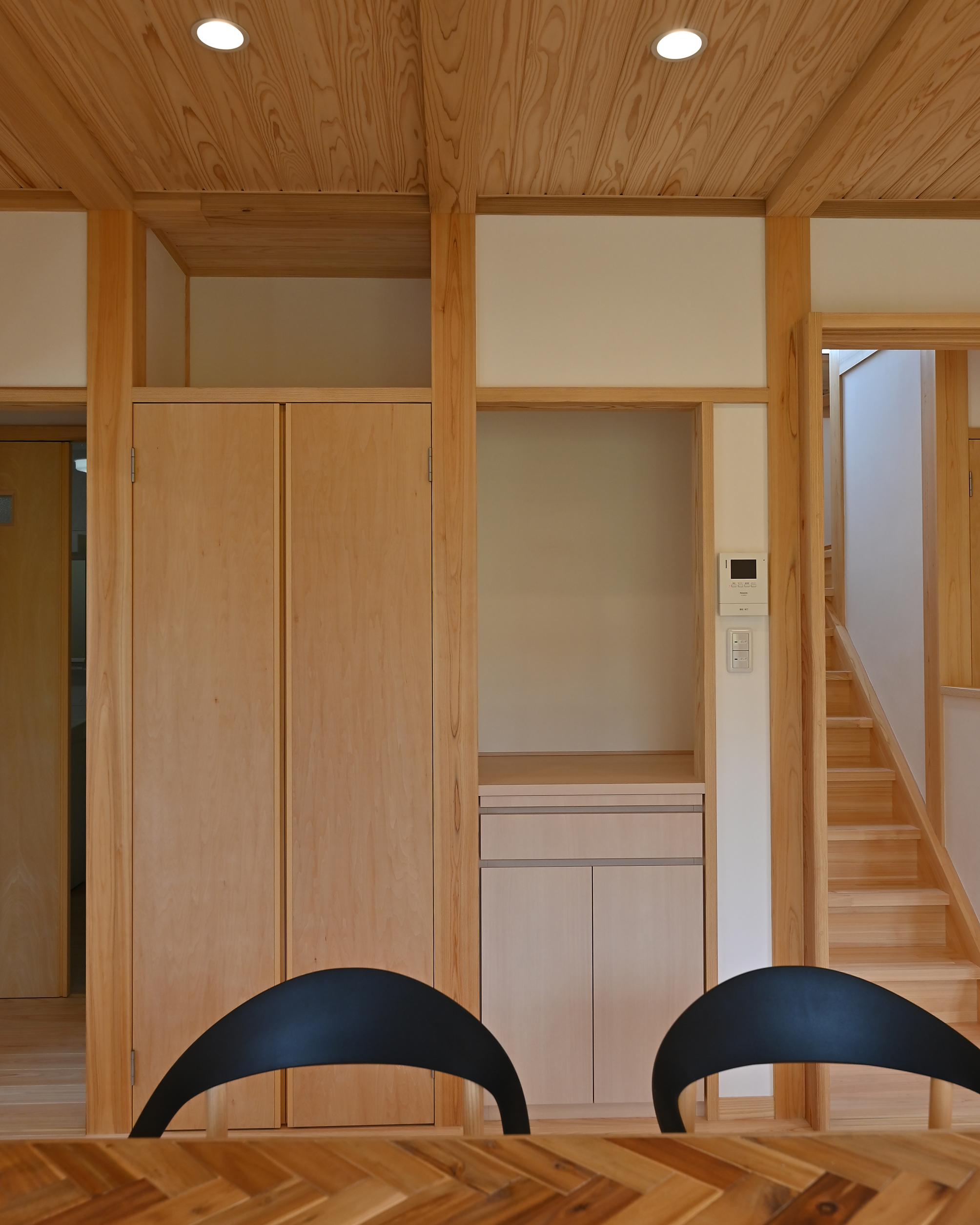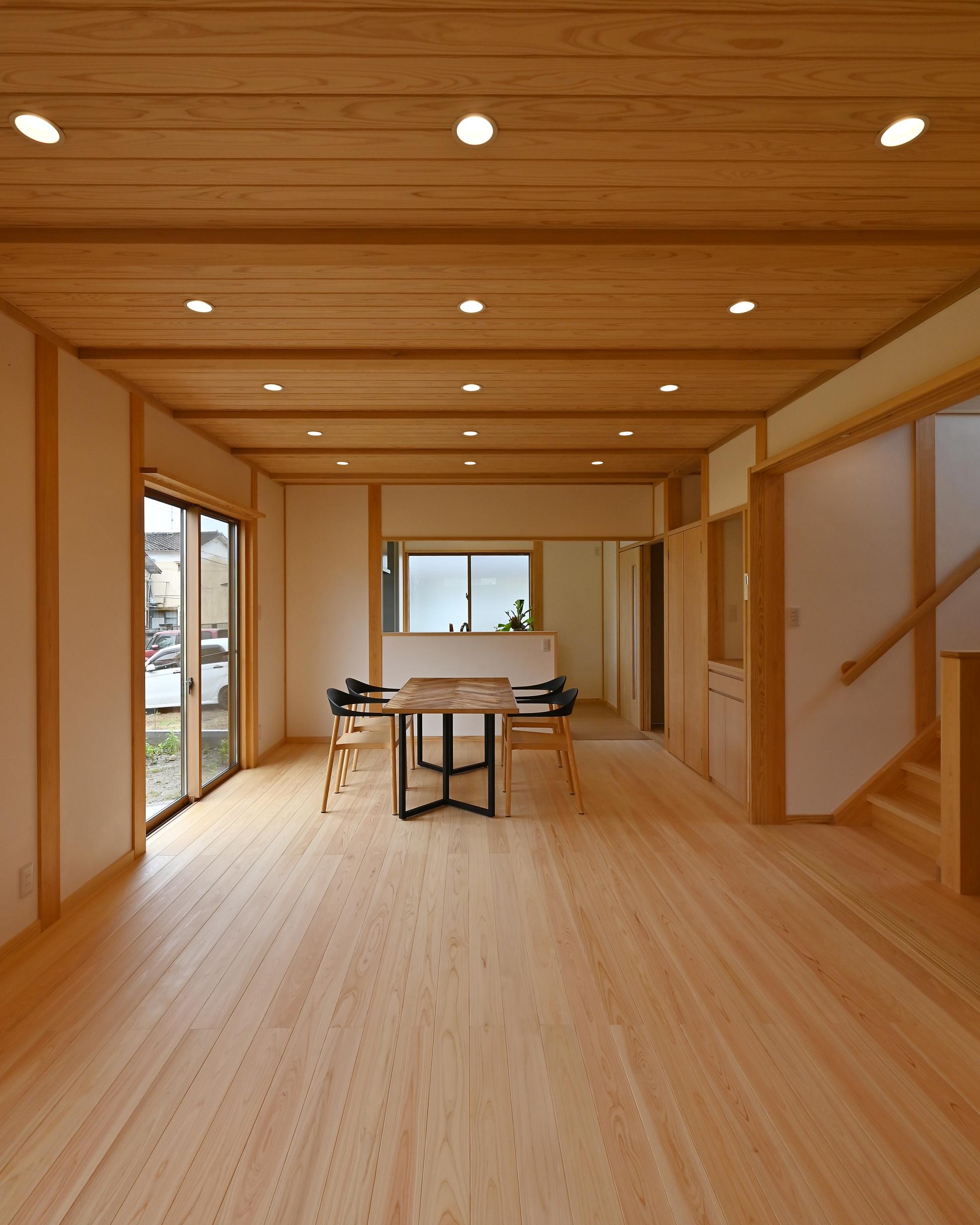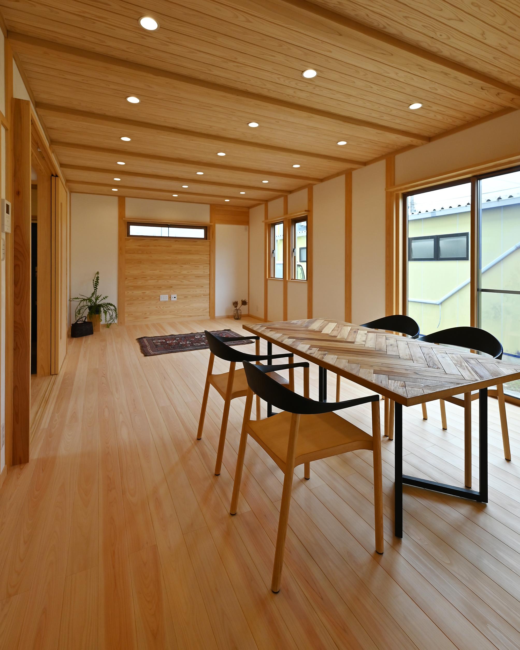 桧の柱、杉の梁、桧の無垢フローリング、杉羽目板の天井、漆喰の壁。自然素材が織りなす空間。清々しい空気が流れています。