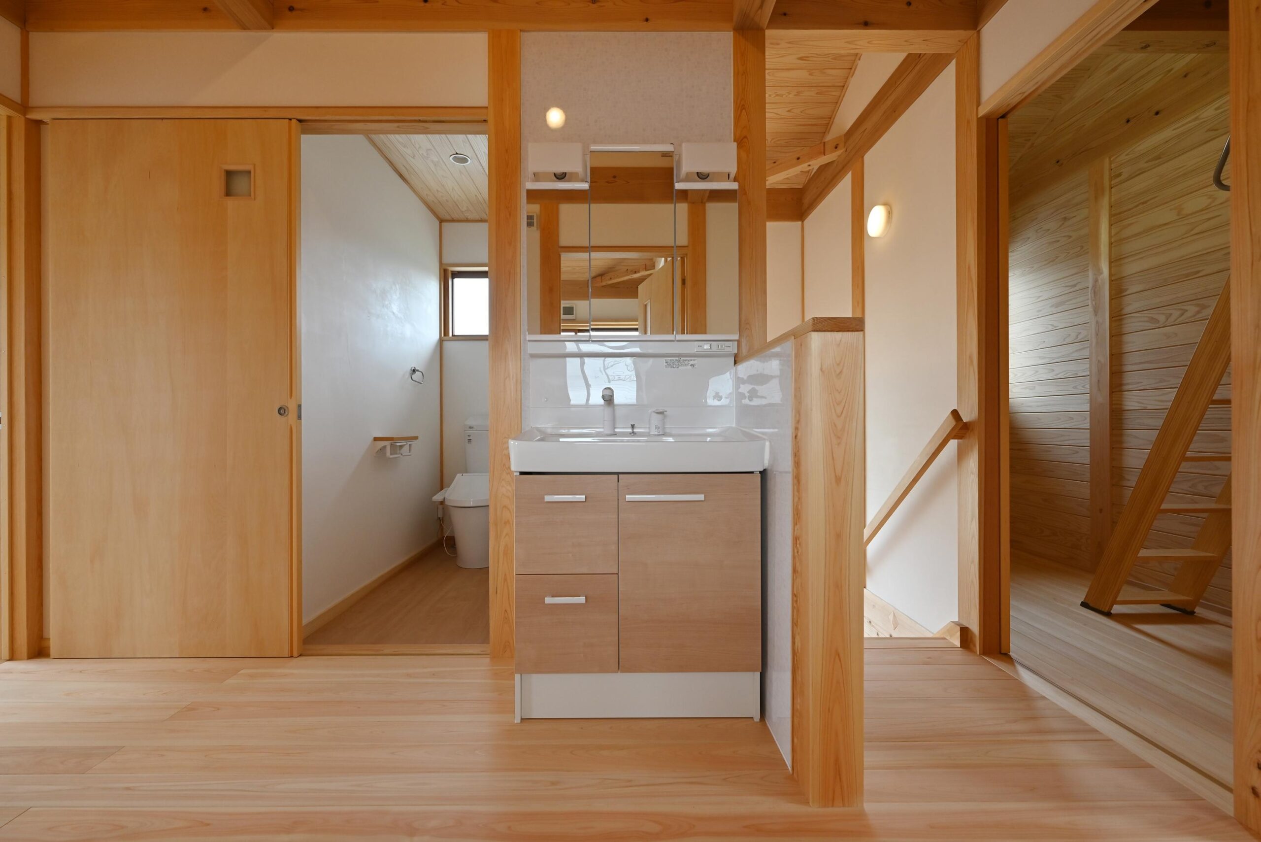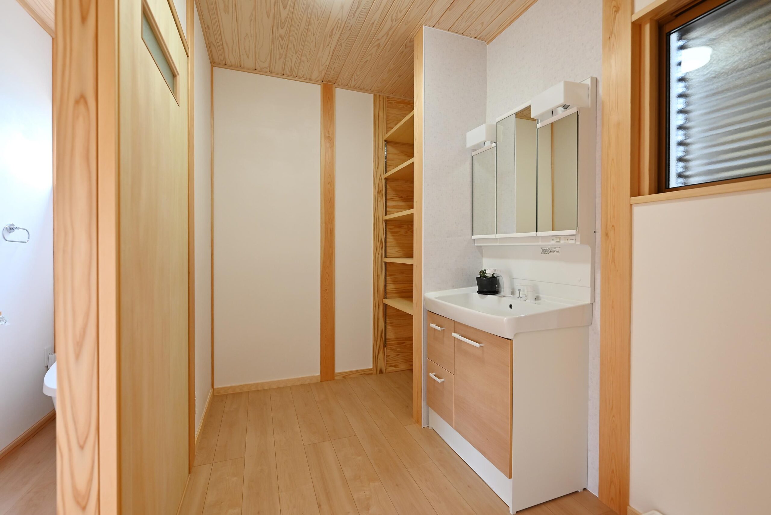 家族5人なので2階にも洗面化粧台を。右手は納戸収納になります。