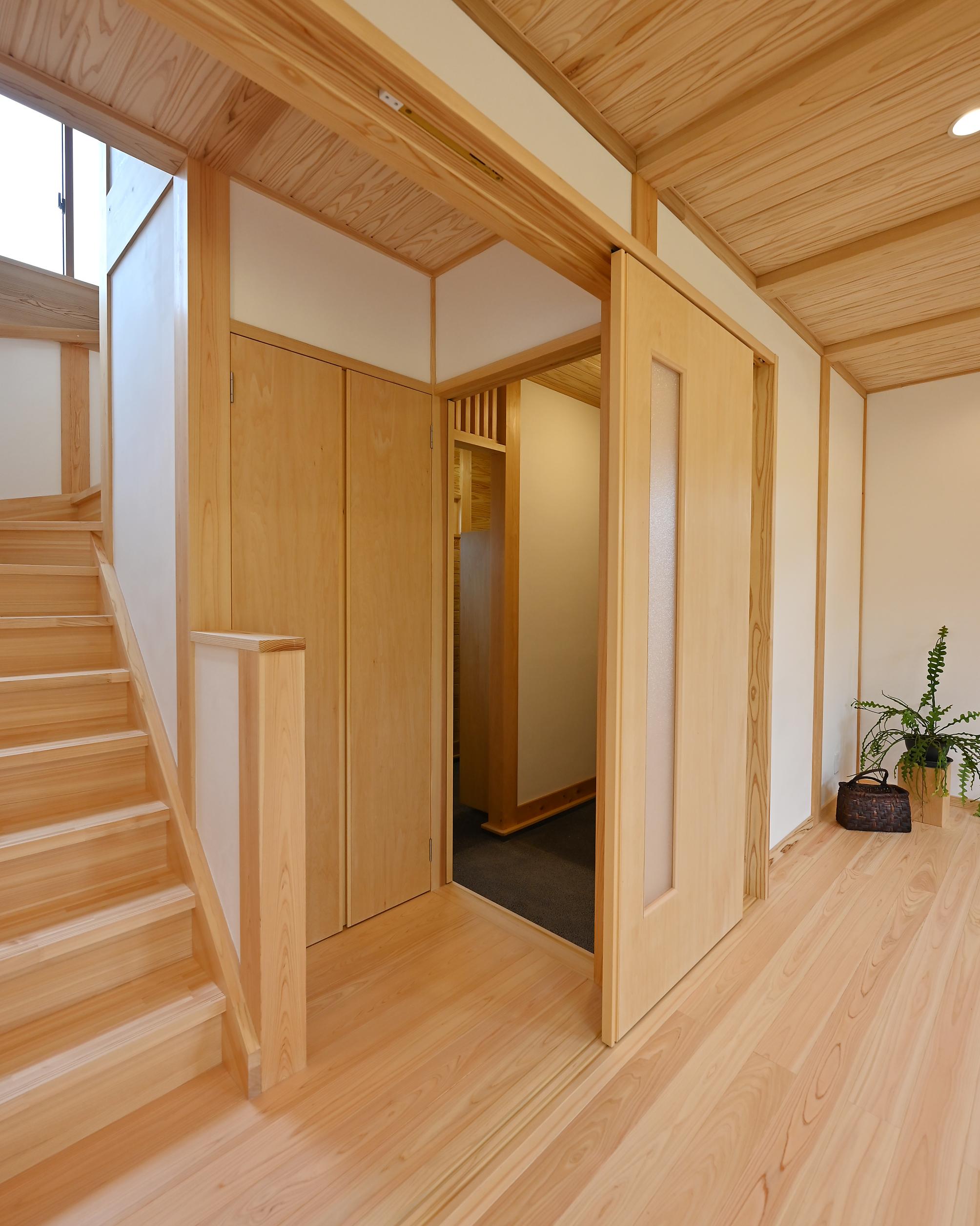 LDKと玄関・階段の間には引き戸を設けて、冷暖房の効率化にも。左手は水周りへ。