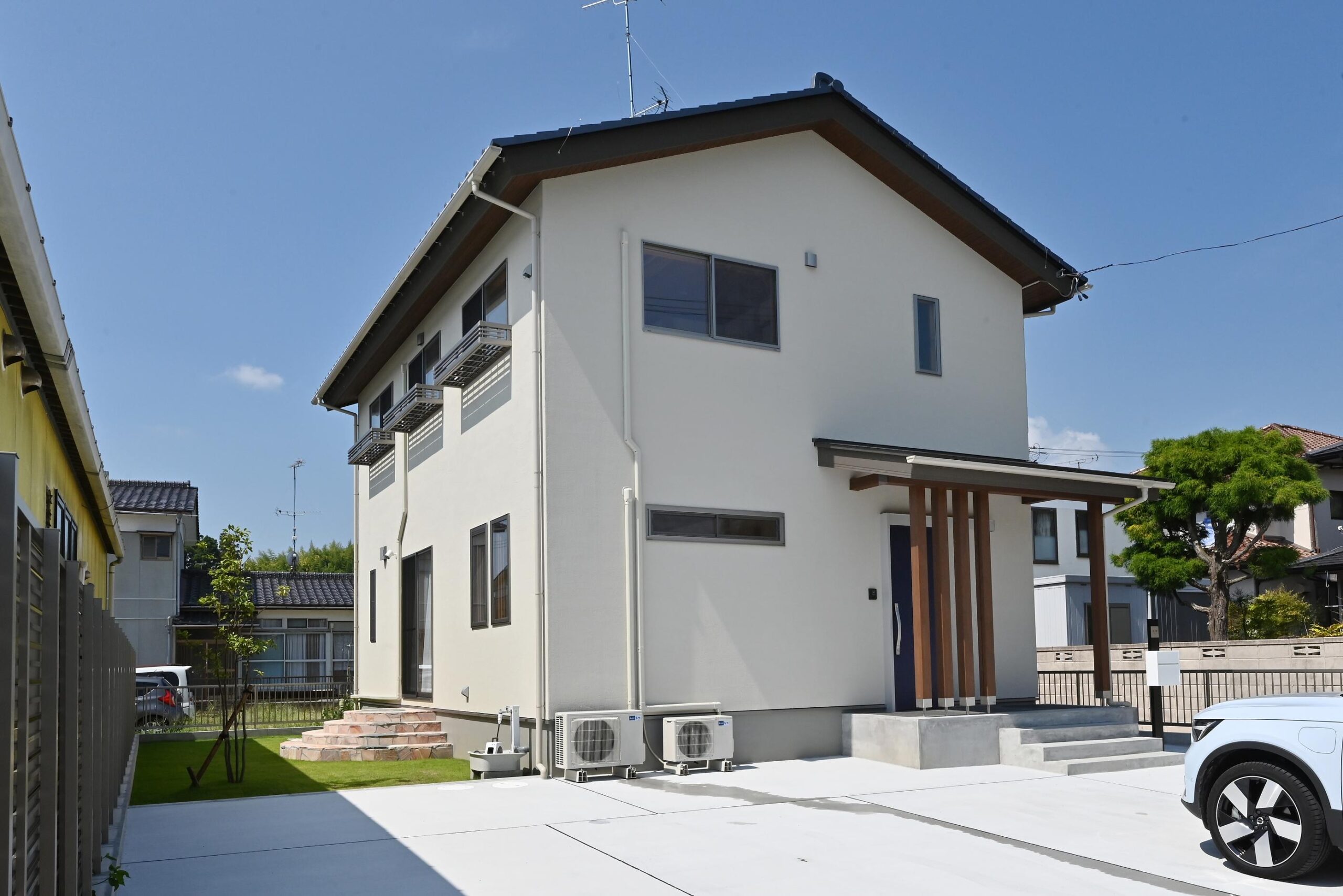 建主様選定のテラコッタ色のタイルと芝生が青空に合いますね。