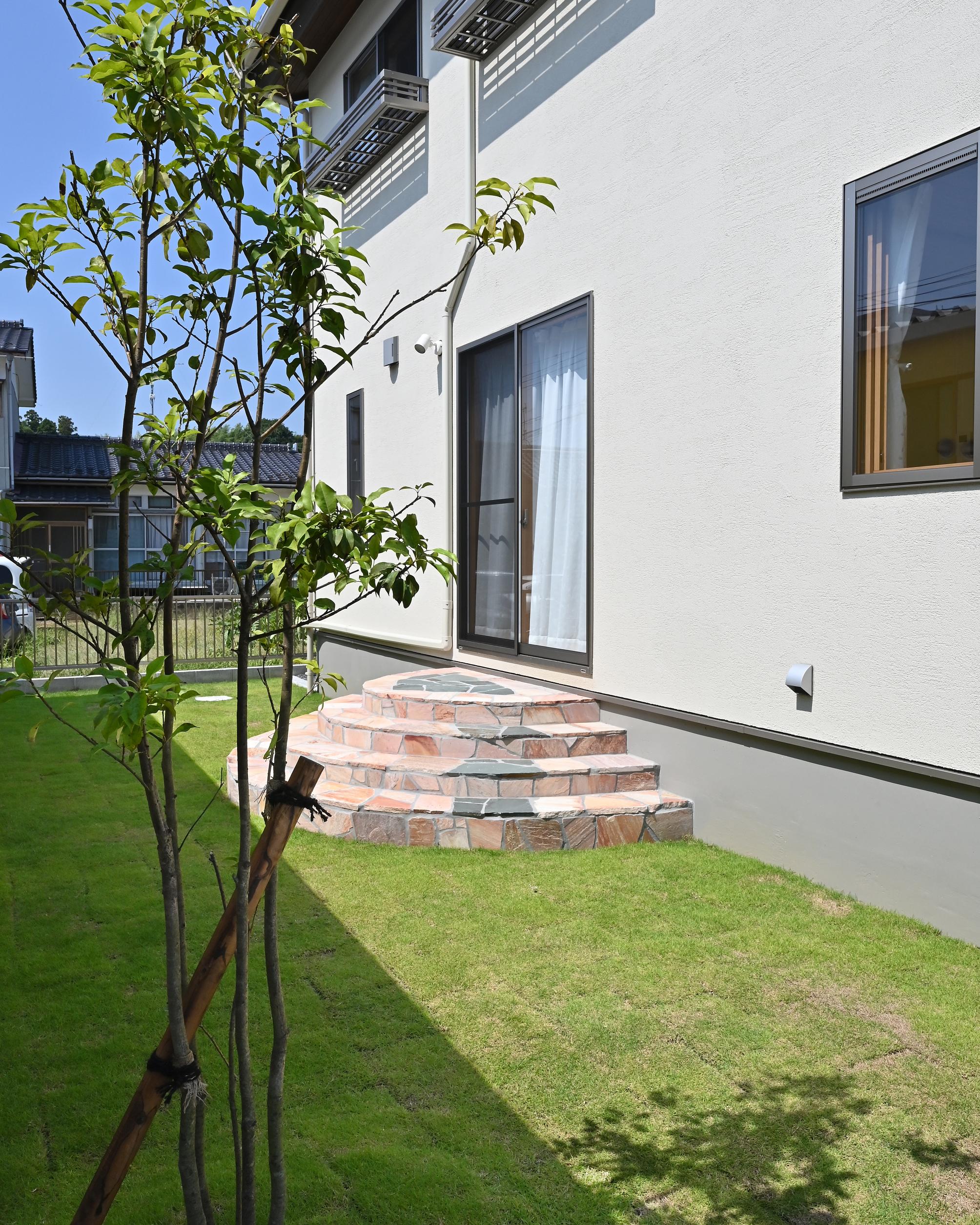 ベランダを設けず花台を設えた2階窓、芝生の庭とタイルの階段など洋にまとめた明るい雰囲気の外観です。