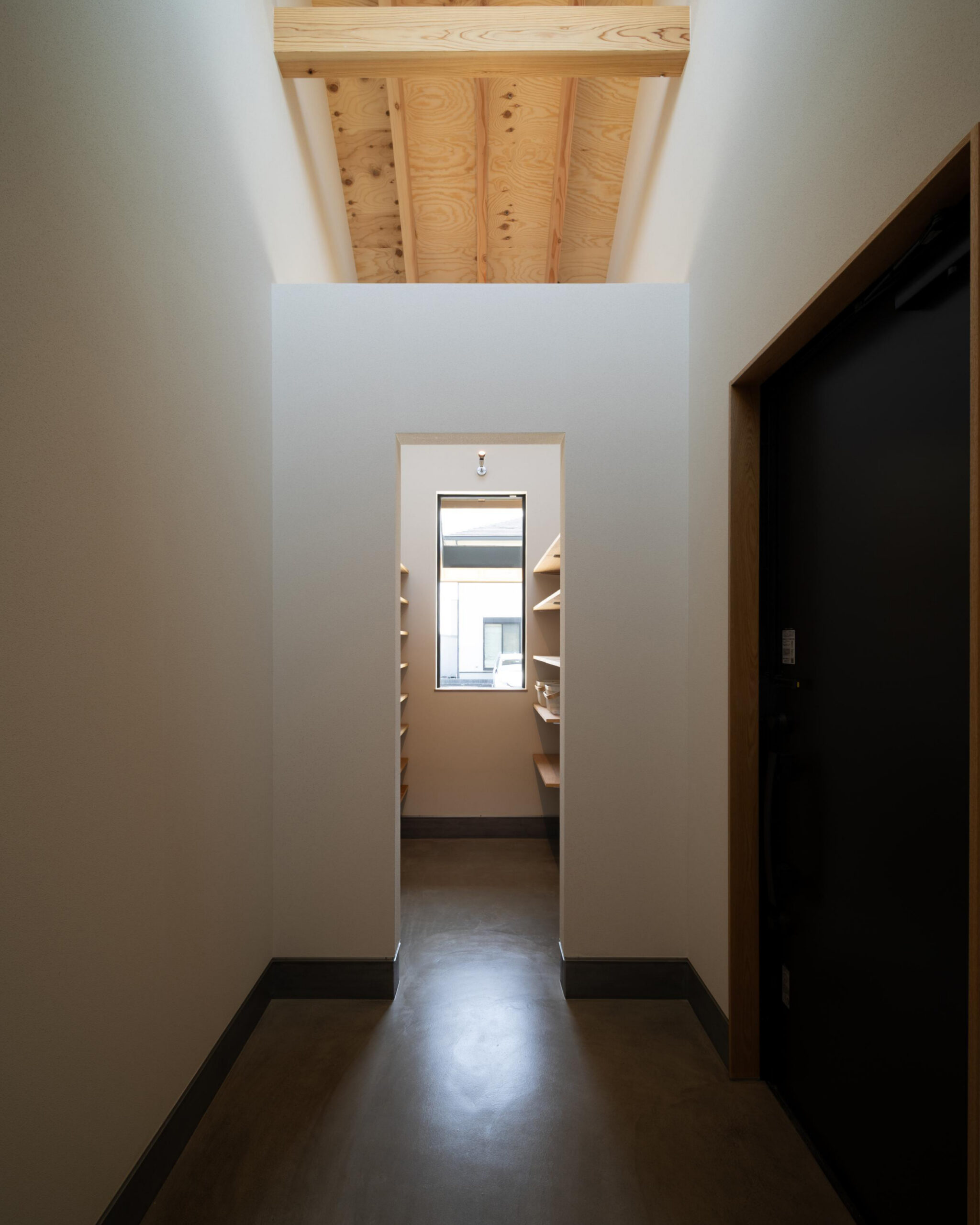 西側の玄関を入ると右手にシューズクローゼット。左手の廊下は水周りを抜けクローゼットまで続きます。