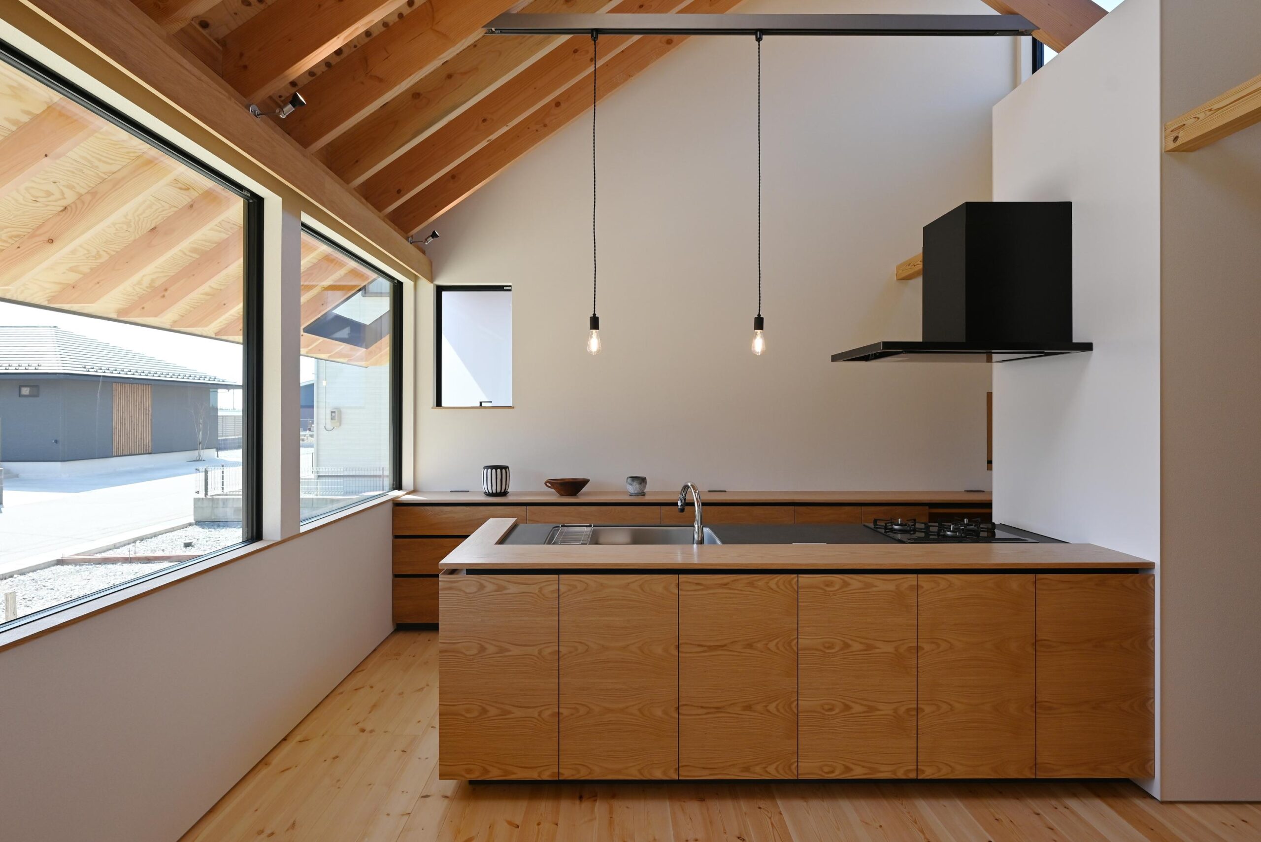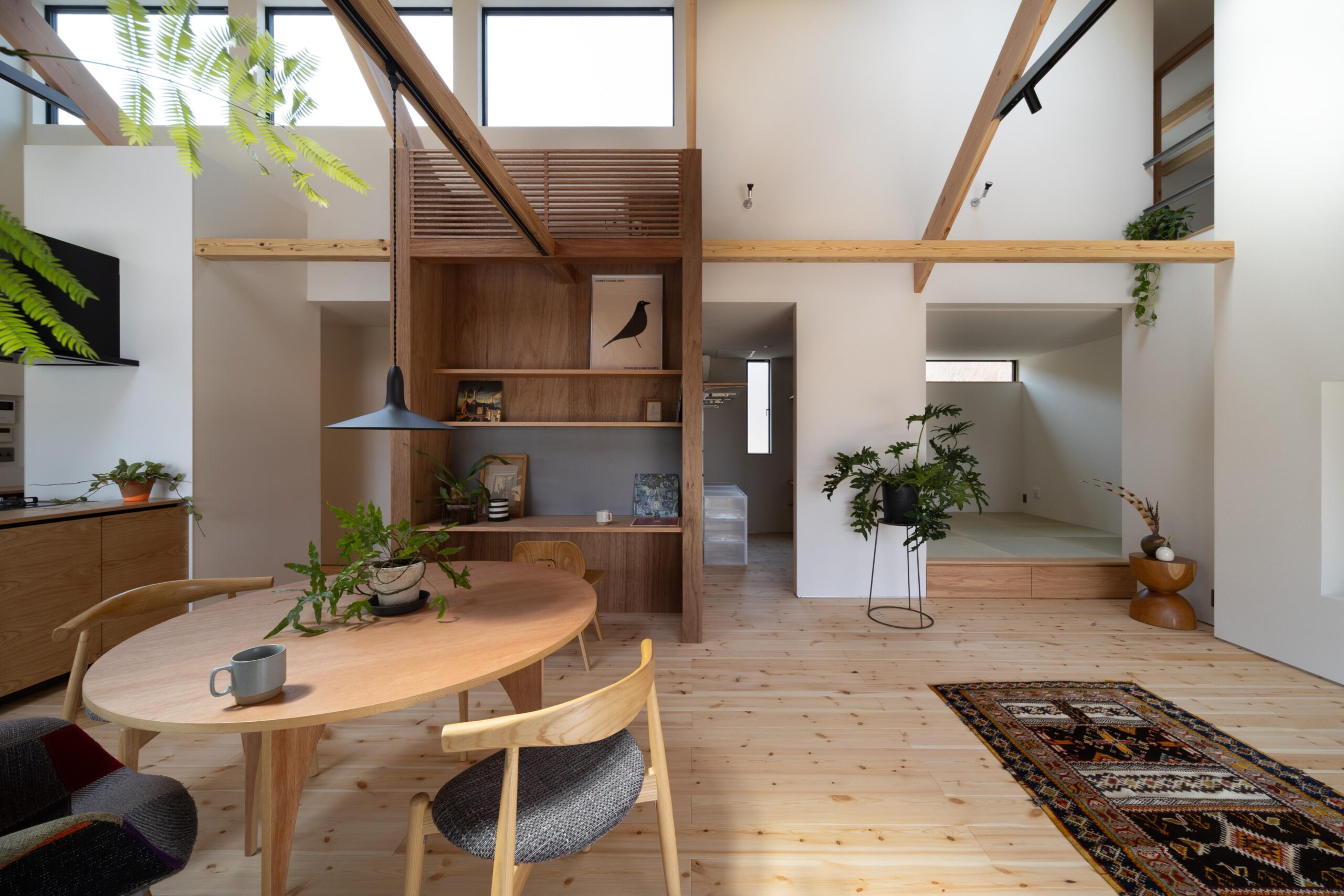 通常、大きな屋根を支えるためには多くの柱が必要になりますが、この家では60mm×240mmの垂木を455mmピッチで配置し、さらに部分的に支え梁を採用することで、フレキシビリティの高い無柱空間を実現しています。これにより、広々としたリビングを自由にレイアウトでき、ライフスタイルの変化にも柔軟に対応できる住まいとなりました。