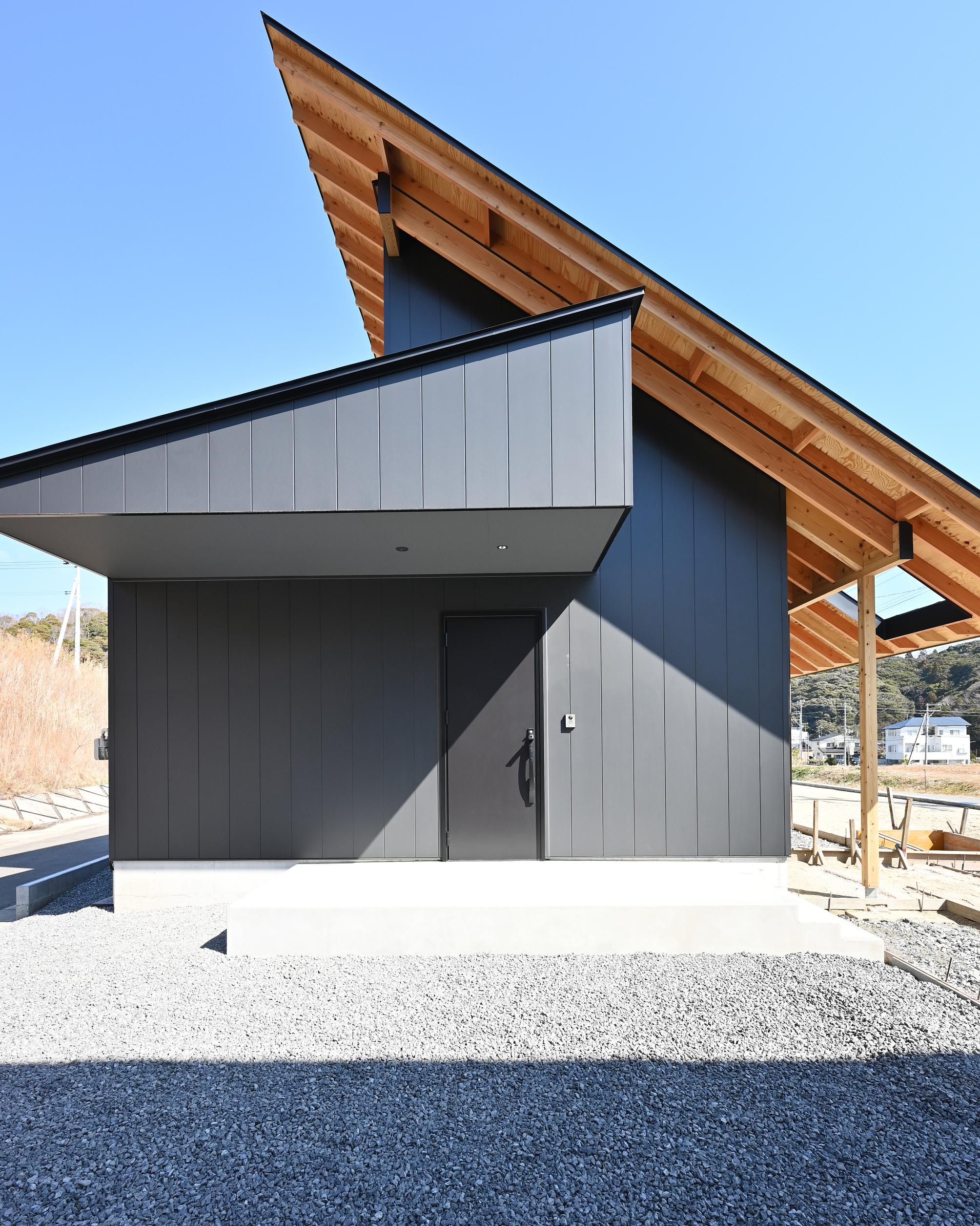第1形態:シーサイドに佇む一見平屋の家。ガルバの大きな屋根が目印、と思いきや・・・