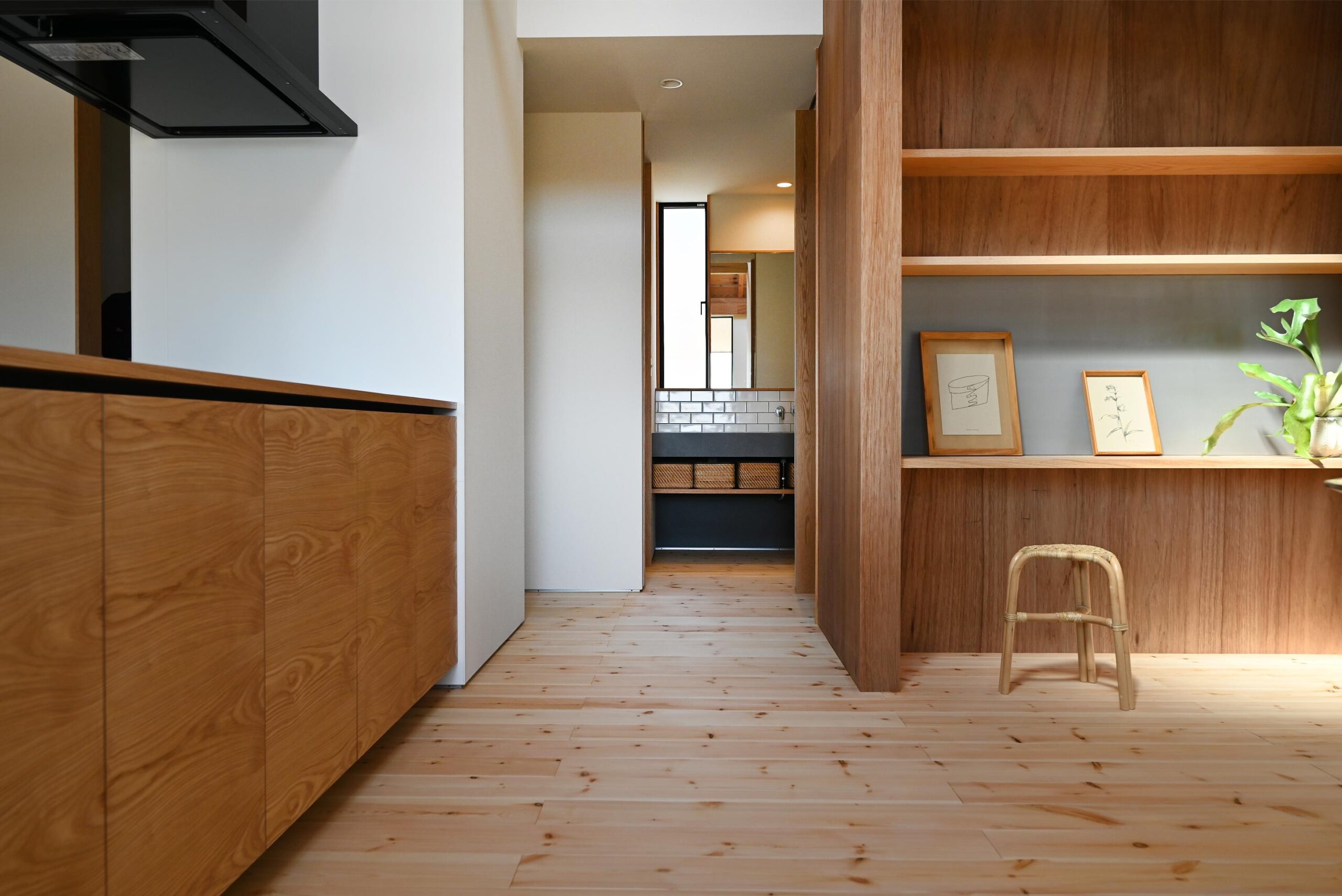 キッチンは造作で、通気も兼ねた取っ手がポイント。冷蔵庫は見えない位置に。
