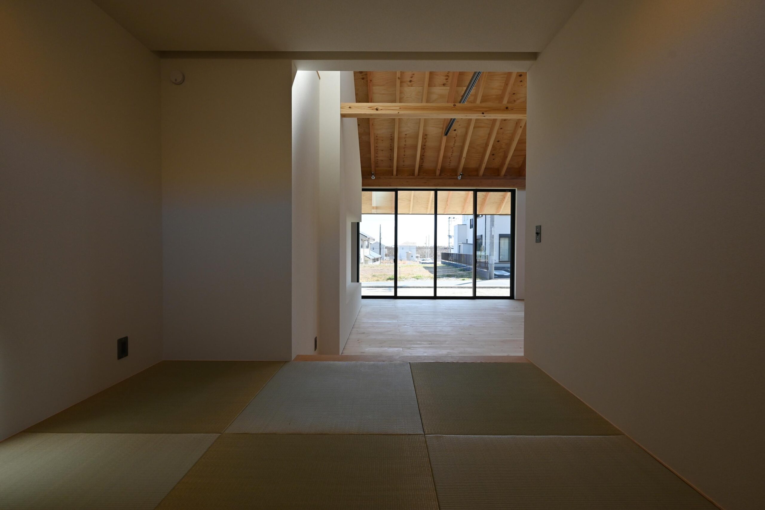 LDKに隣接する小上がり和室。小上がりの下は収納。琉球畳の張り方で市松模様に。