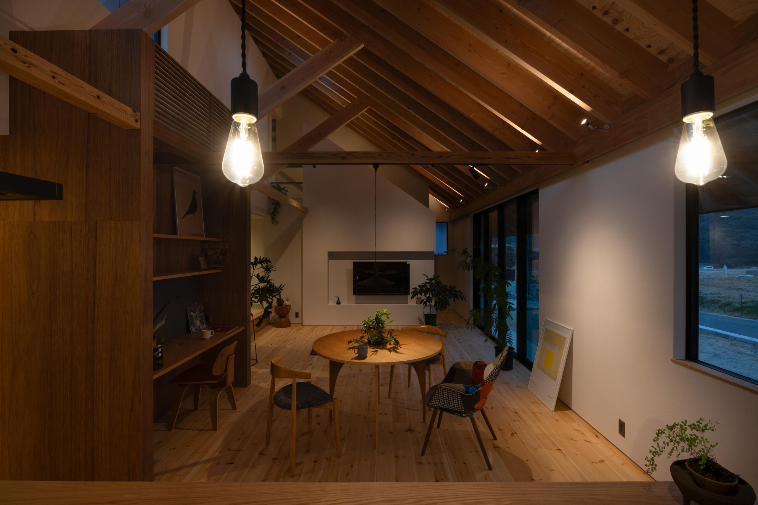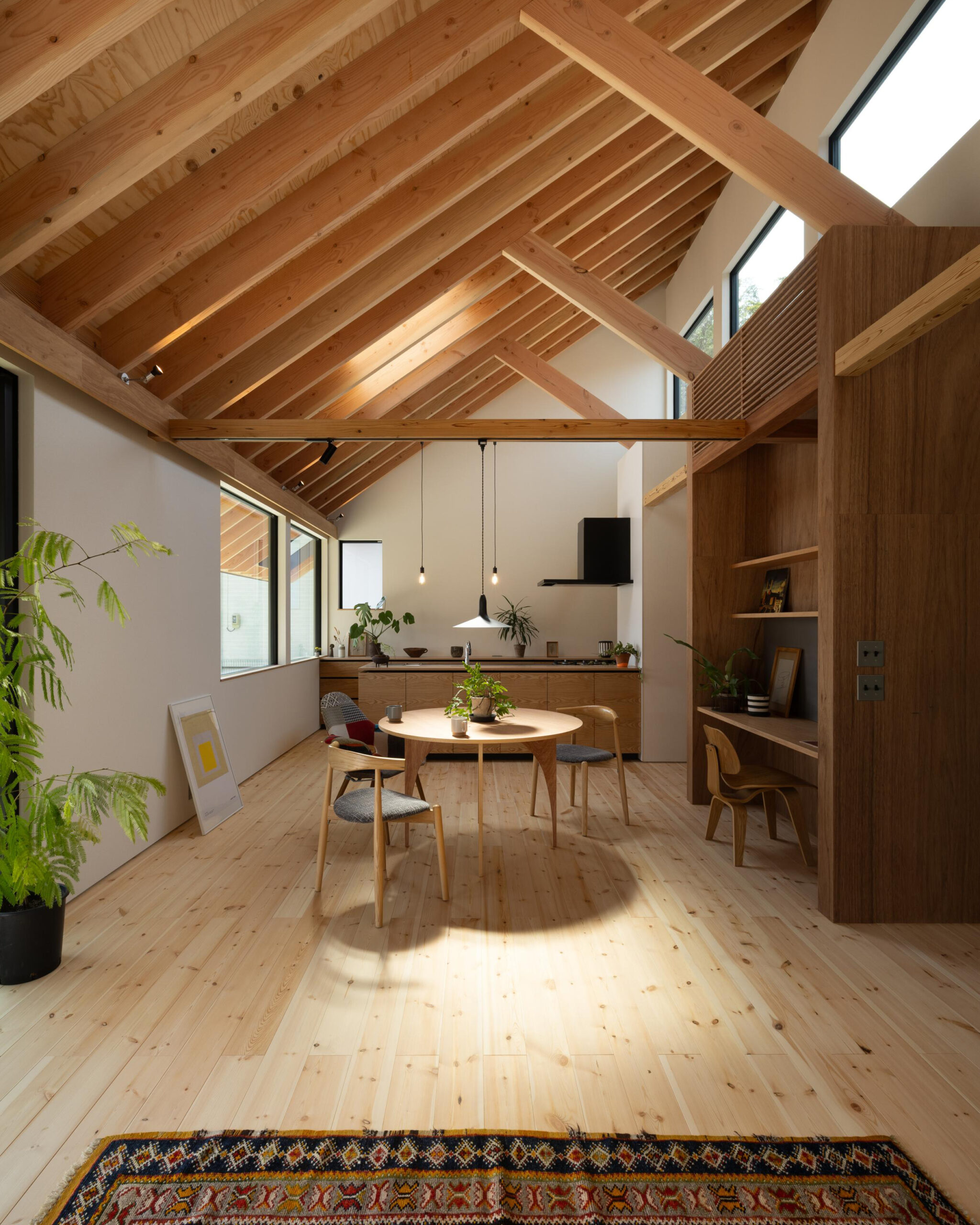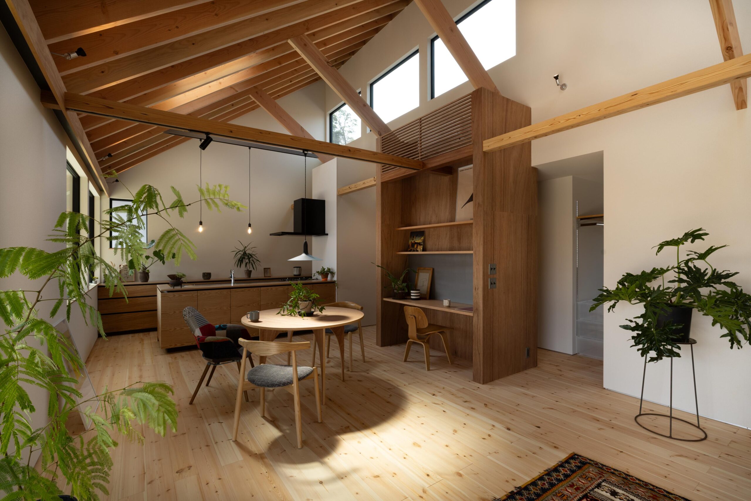 通常、大きな屋根を支えるためには多くの柱が必要になりますが、この家では60mm×240mmの垂木を455mmピッチで配置し、さらに部分的に支え梁を採用することで、フレキシビリティの高い無柱空間を実現しています。これにより、広々としたリビングを自由にレイアウトでき、ライフスタイルの変化にも柔軟に対応できる住まいとなりました。
