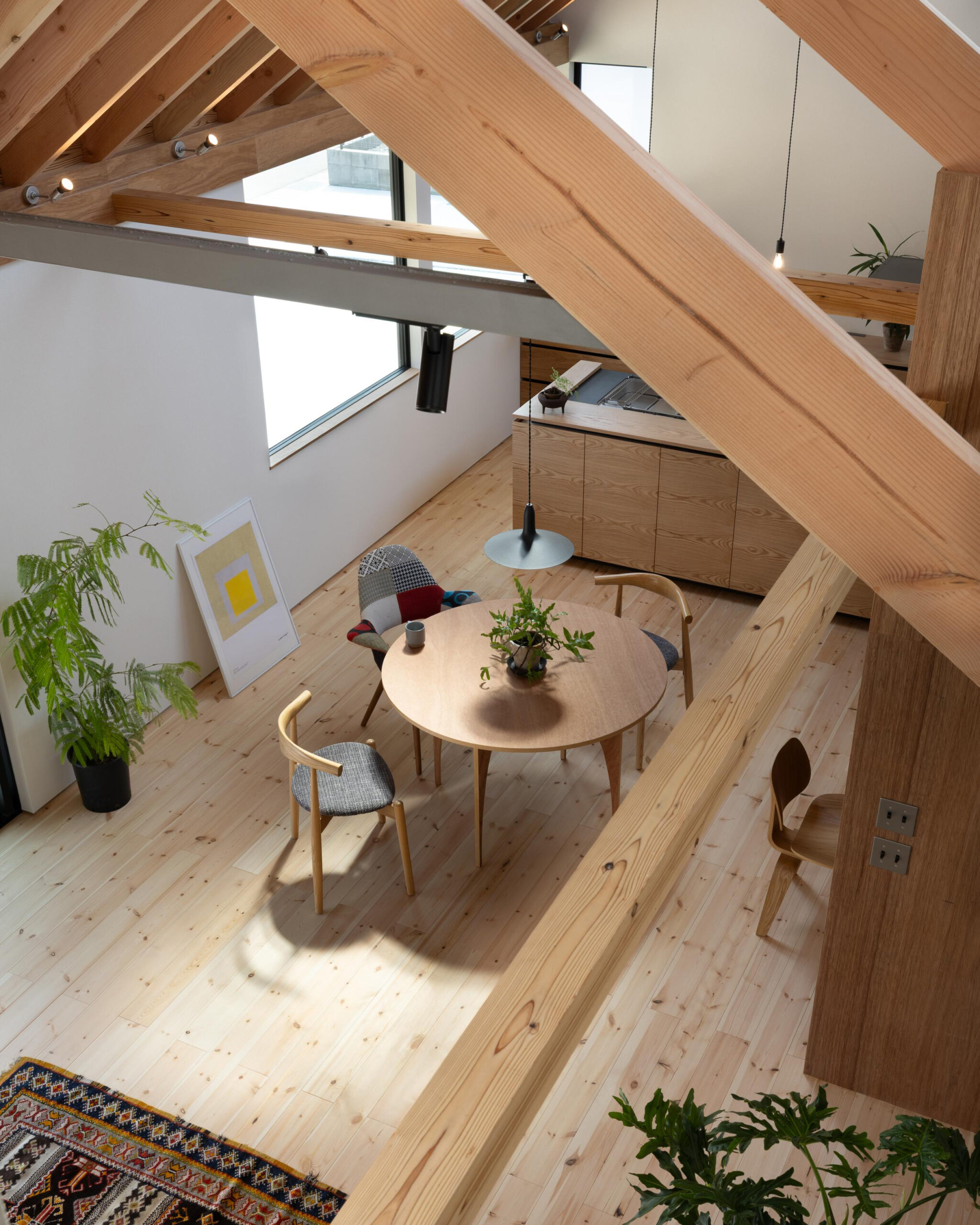大空間を形成するための構造がそのまま空間の味わいとなっています。テレビ台の後ろは階段と居室。