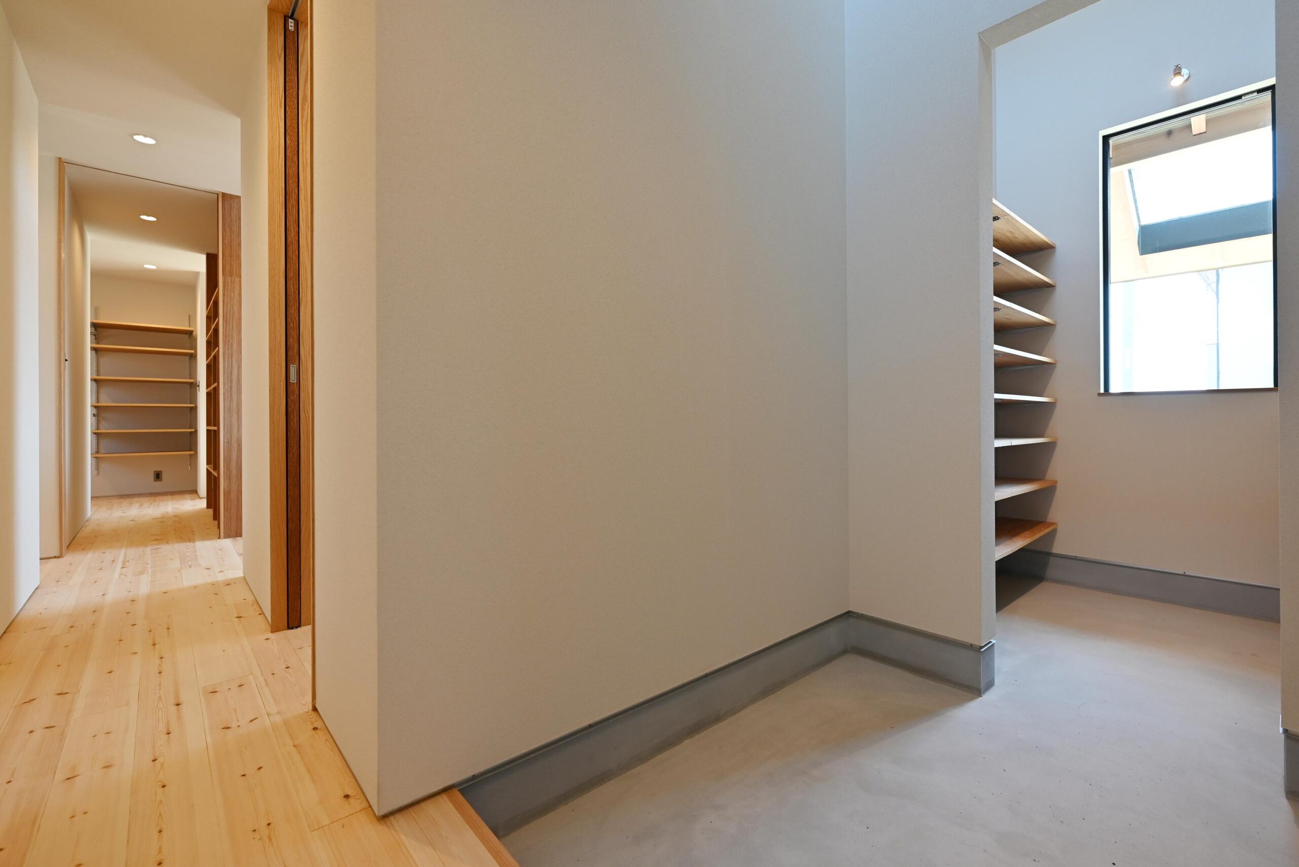 西側の玄関を入ると右手にシューズクローゼット。左手の廊下は水周りを抜けクローゼットまで続きます。