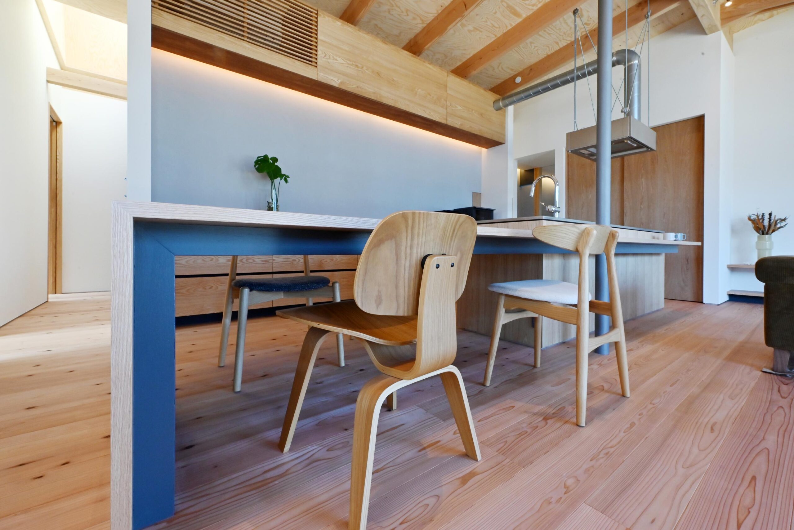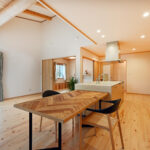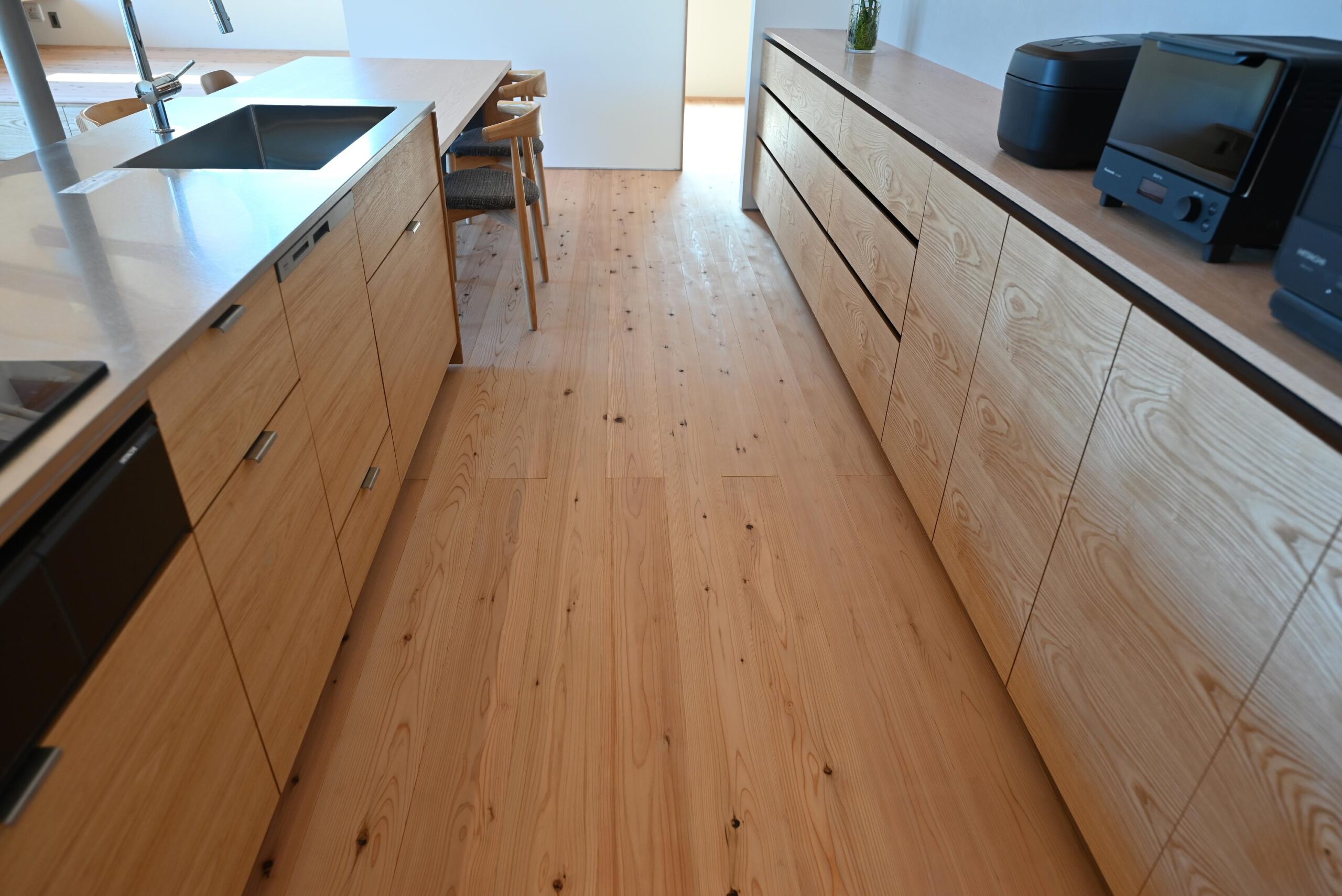 キッチンとダイニングテーブルを一体化して造作しました。配膳がしやすく、家族の会話が弾む配置です。建具関係はタモで統一されています。