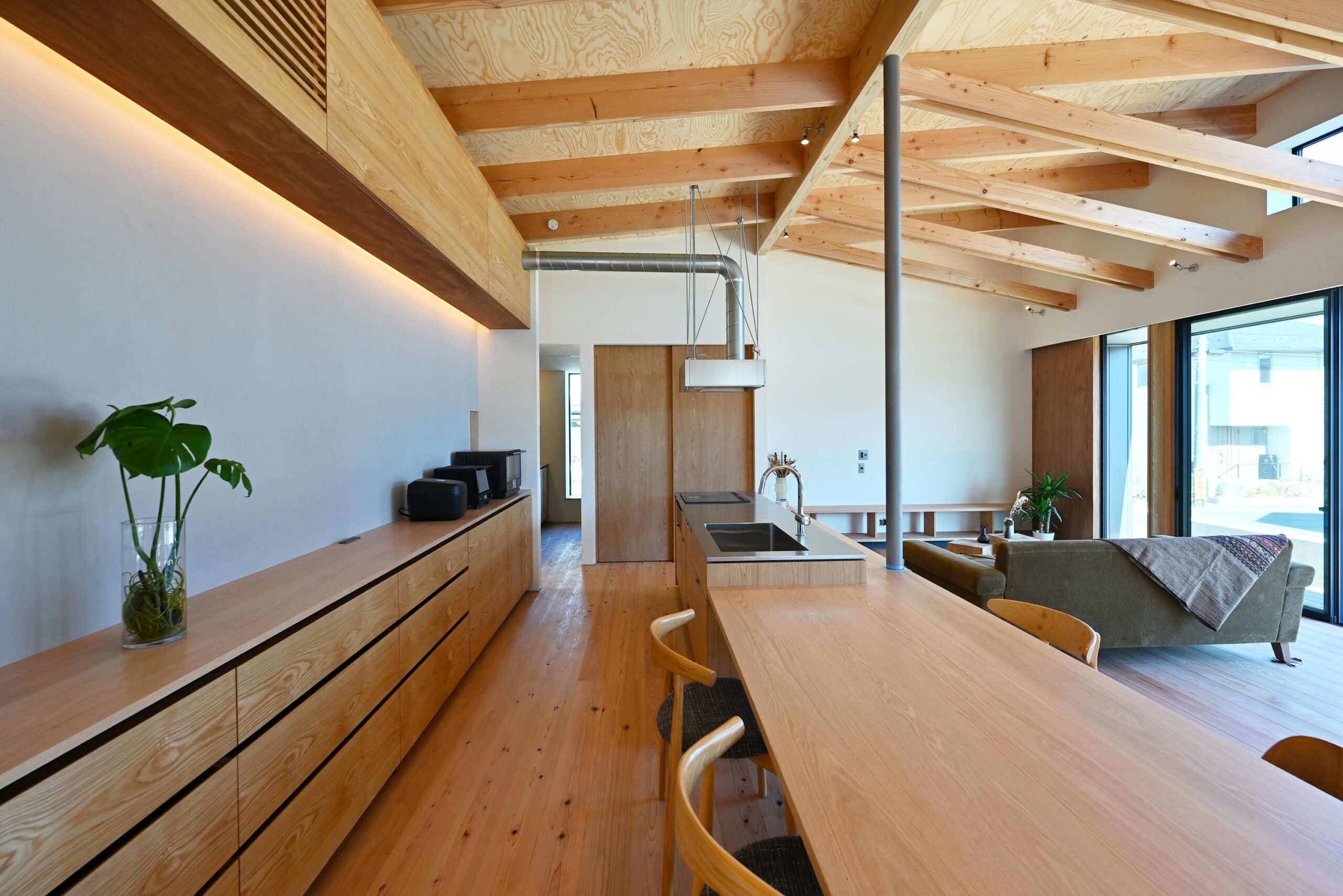 「家族みんなで広々と過ごしたい」「木の温かみを感じる家に住みたい」—。そんなご要望から生まれたのは、4人家族がゆったり暮らせる37坪の平屋です。30畳のリビングを家の中心に、まるで一つの屋根に包まれたワンルームのような空間を実現しました。