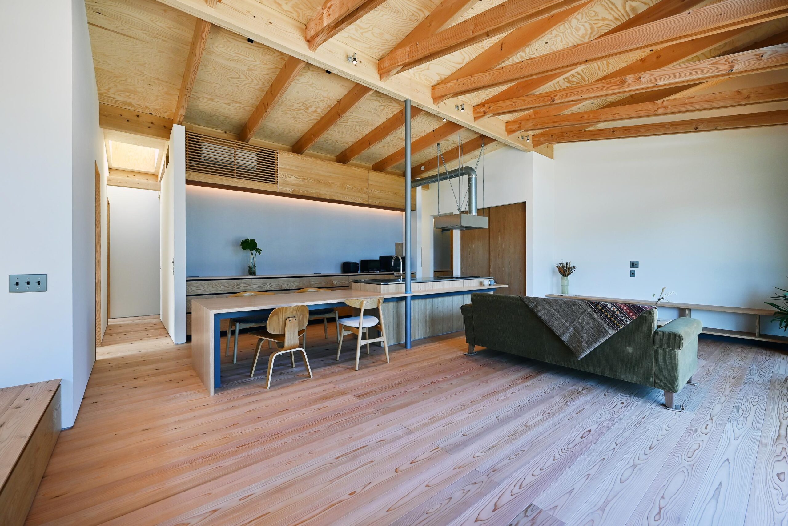 内部は、広がりを最大限に引き出すため、あえて間仕切りを最小限に。大空間を可能にする「挟み梁」と細い鉄骨柱を採用し、浮遊感のある伸びやかな空間を創出しています。