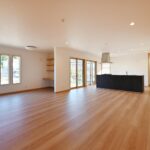 内装は、ラワン合板やラーチ合板を、床には日光杉を使用。木の温もりと洗練された空間が調和します。リビングに隣接する小上がりの畳スペースは、多目的に使える安らぎの場。北側の天窓から差し込む安定した光が、住まい全体を包み込みます。そして、リビングから繋がる広々としたウッドデッキは、内外を繋ぐもう一つの開放的な空間です。