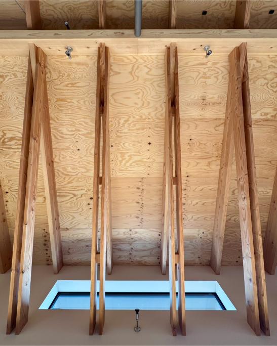 昔ながらの工法でありながら近未来的にも見えるはさみ梁の架構は、躯体の強度を上げ柱を極力減らして大空間を実現します。窓上はロールスクリーンが隠れるよう壁をふかしています。