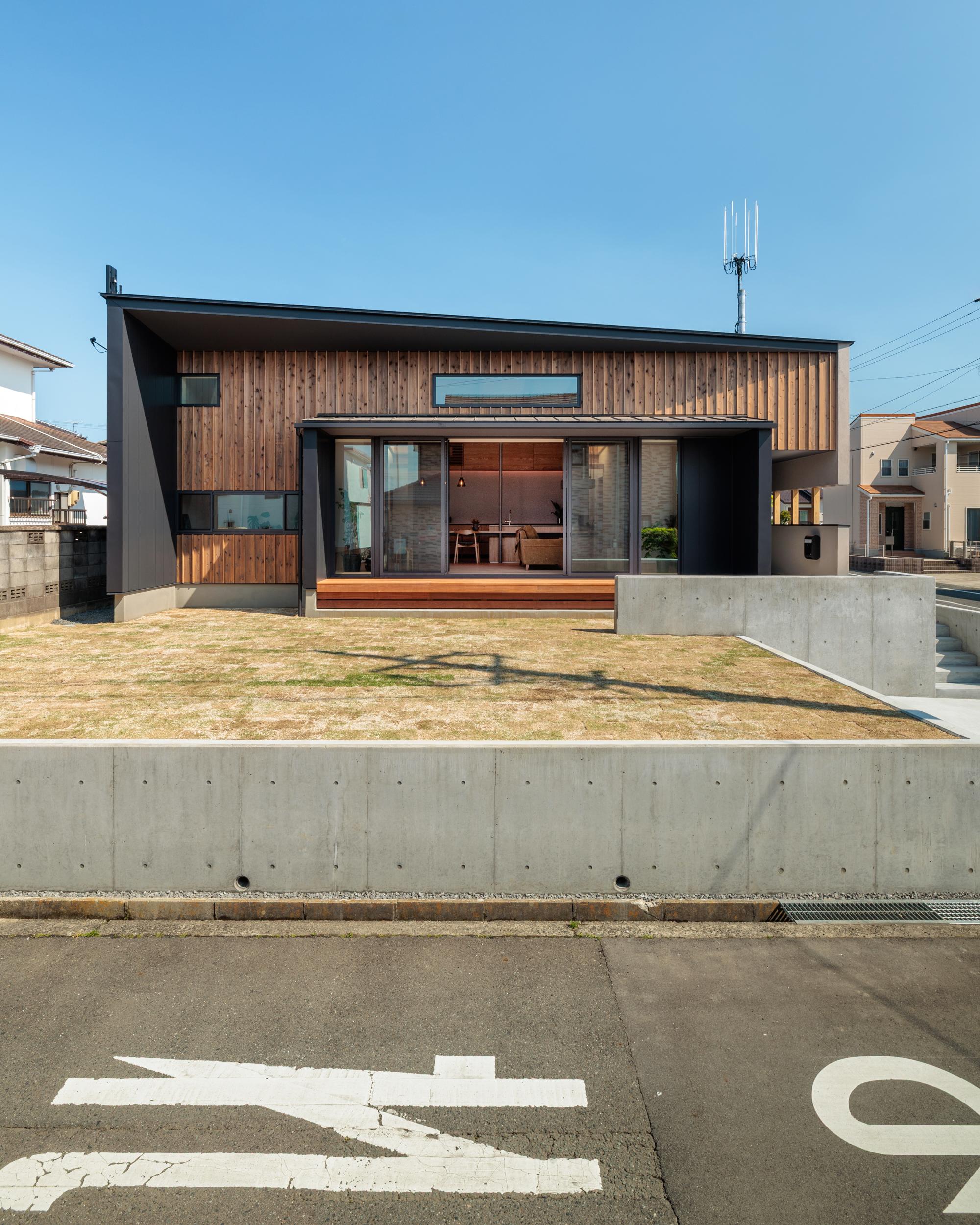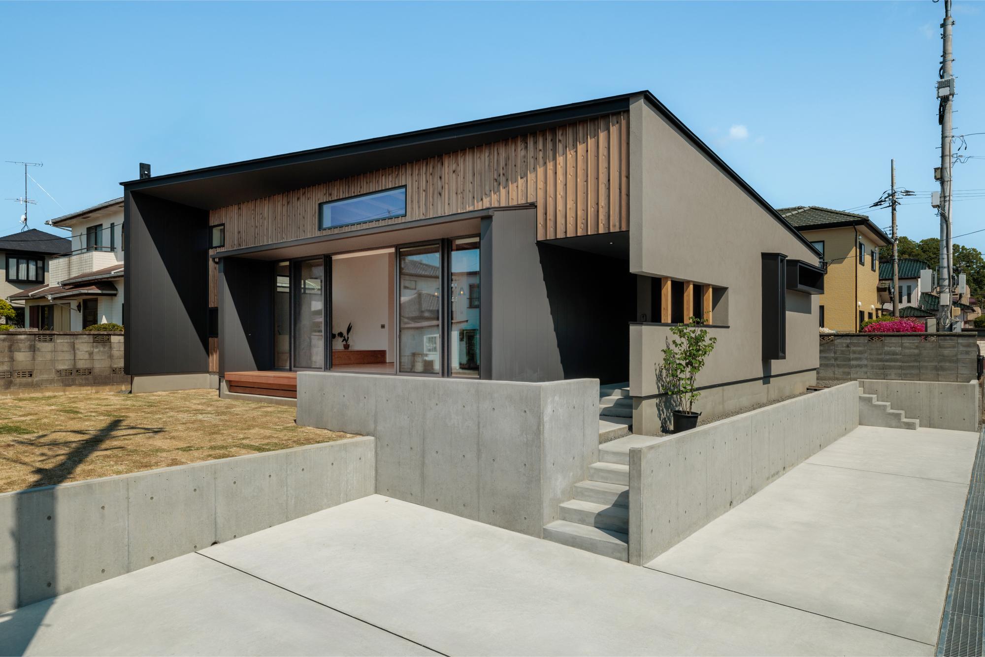 住宅街のど真ん中。高低差のある敷地に、大小二つの屋根をずれながら重層するように配置し、時間によって表情の変化が生まれるようデザインされています。