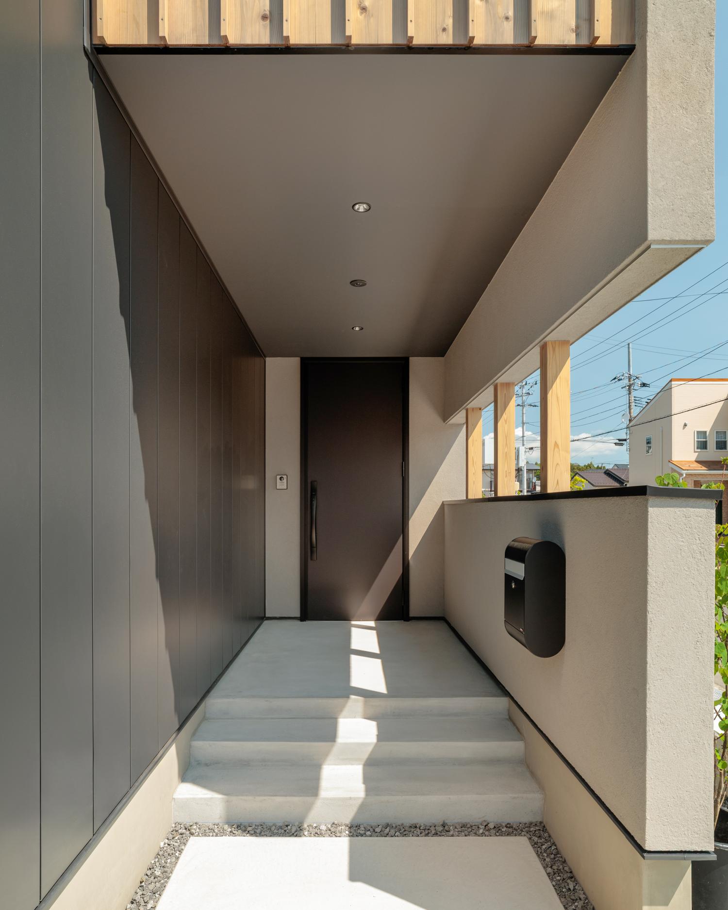 東側の玄関アプローチ。光を取り入れつつ視線が外れるよう壁を配置。