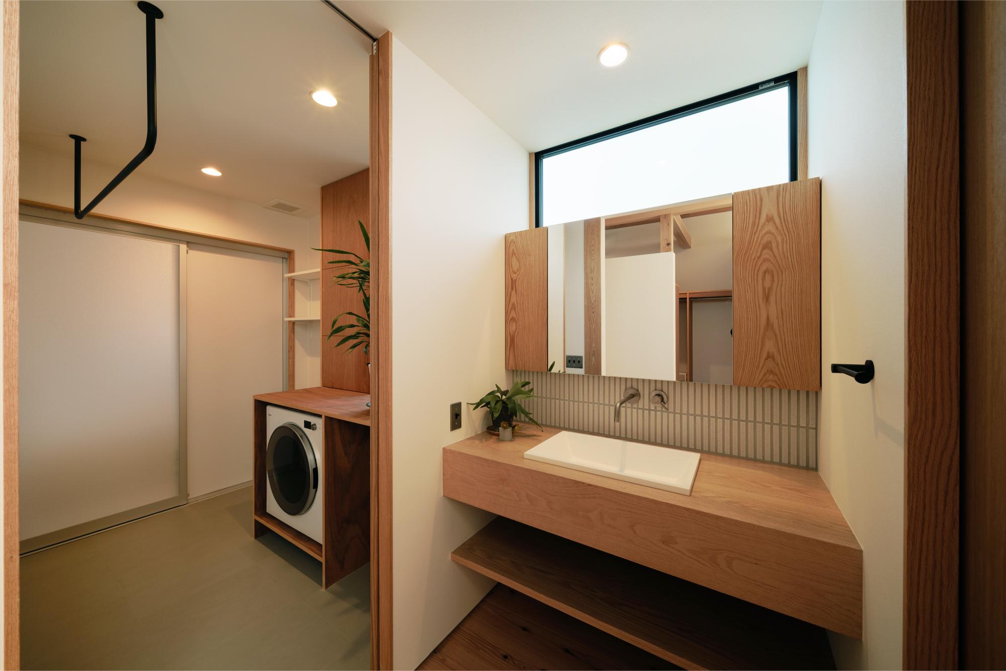 脱衣室の棚は家電や収納に合わせて造作。幹太くんは取り出しやすいように下に配置。