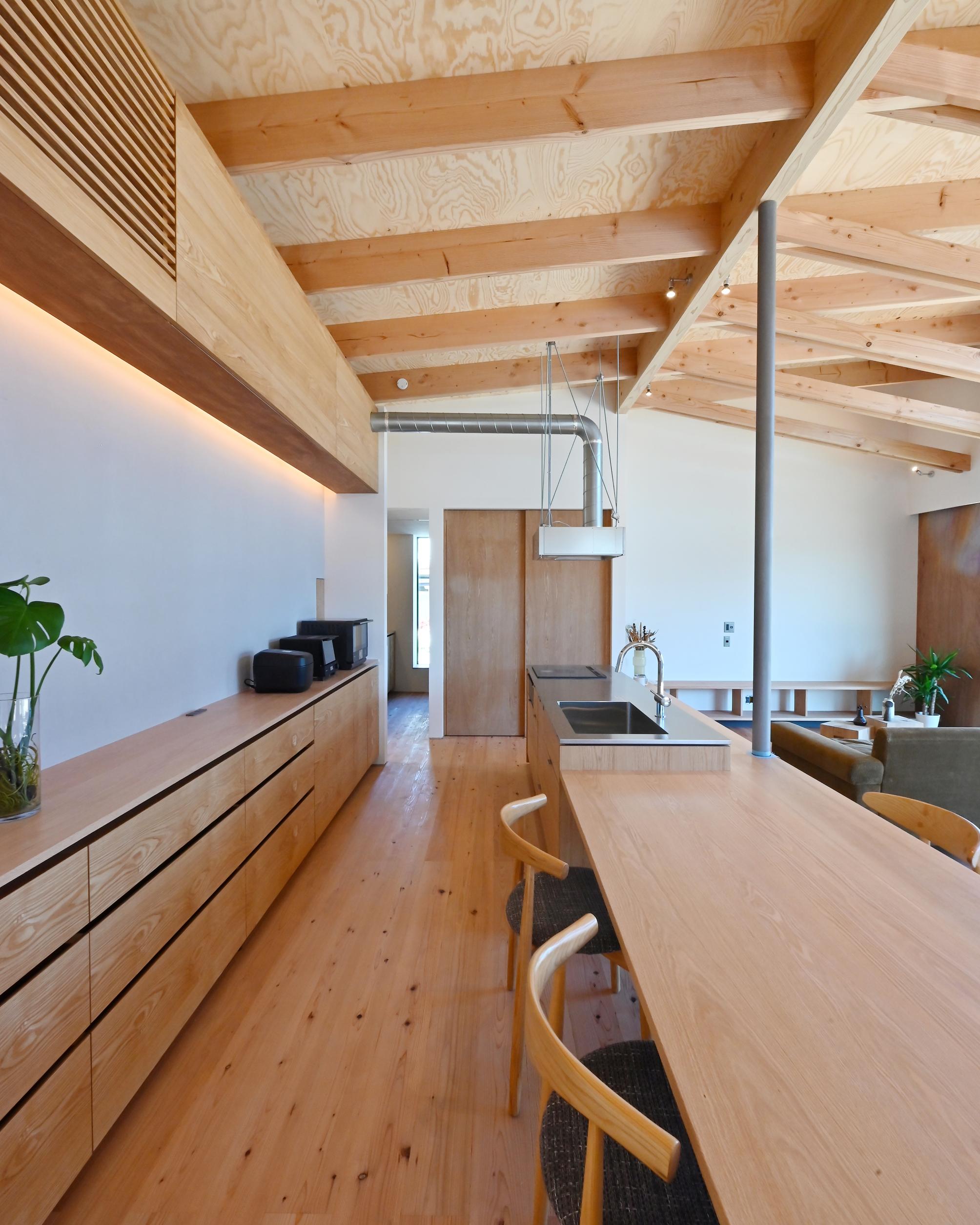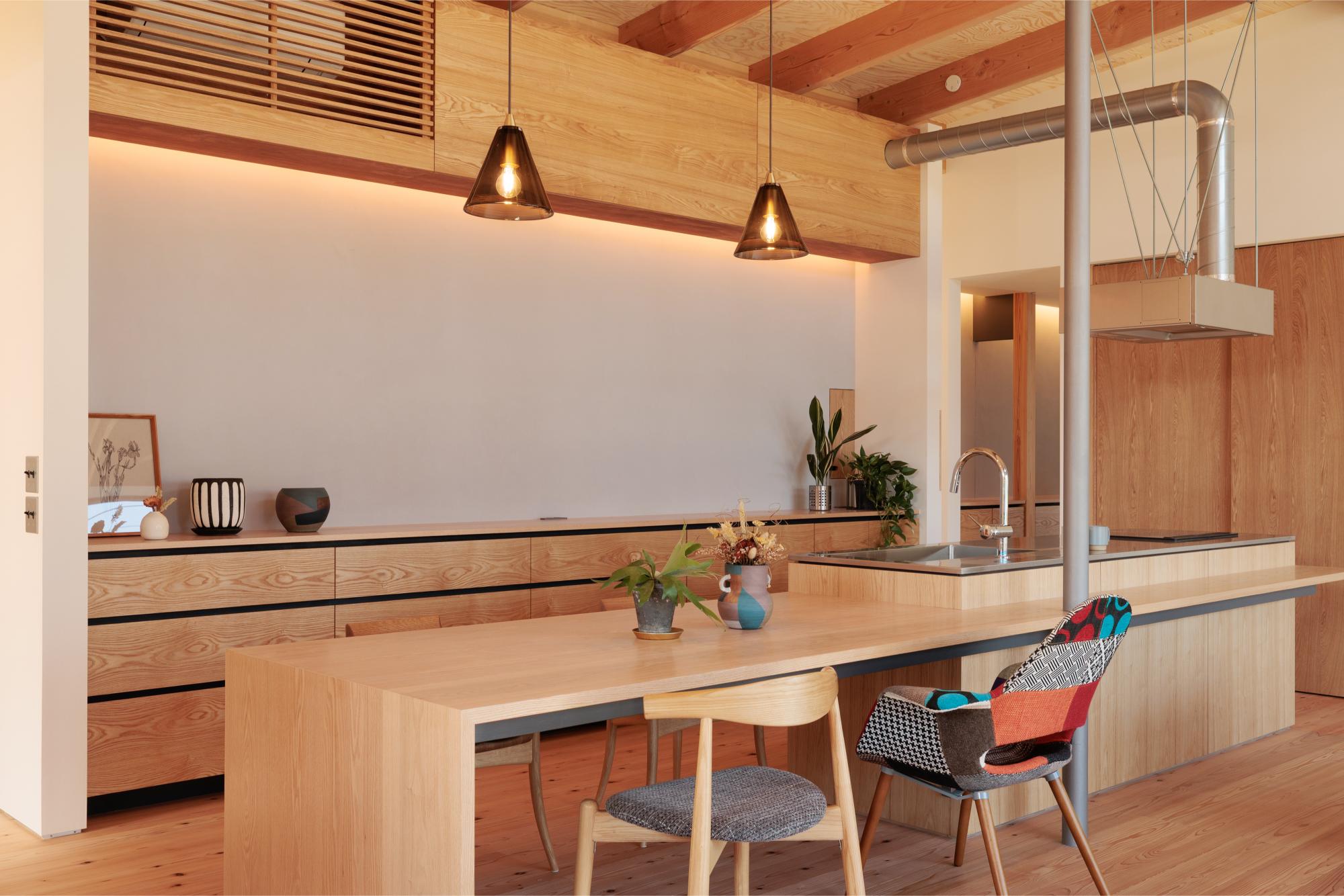 キッチンとダイニングテーブルを一体化して造作しました。配膳がしやすく、家族の会話が弾む配置です。建具関係はタモで統一されています。