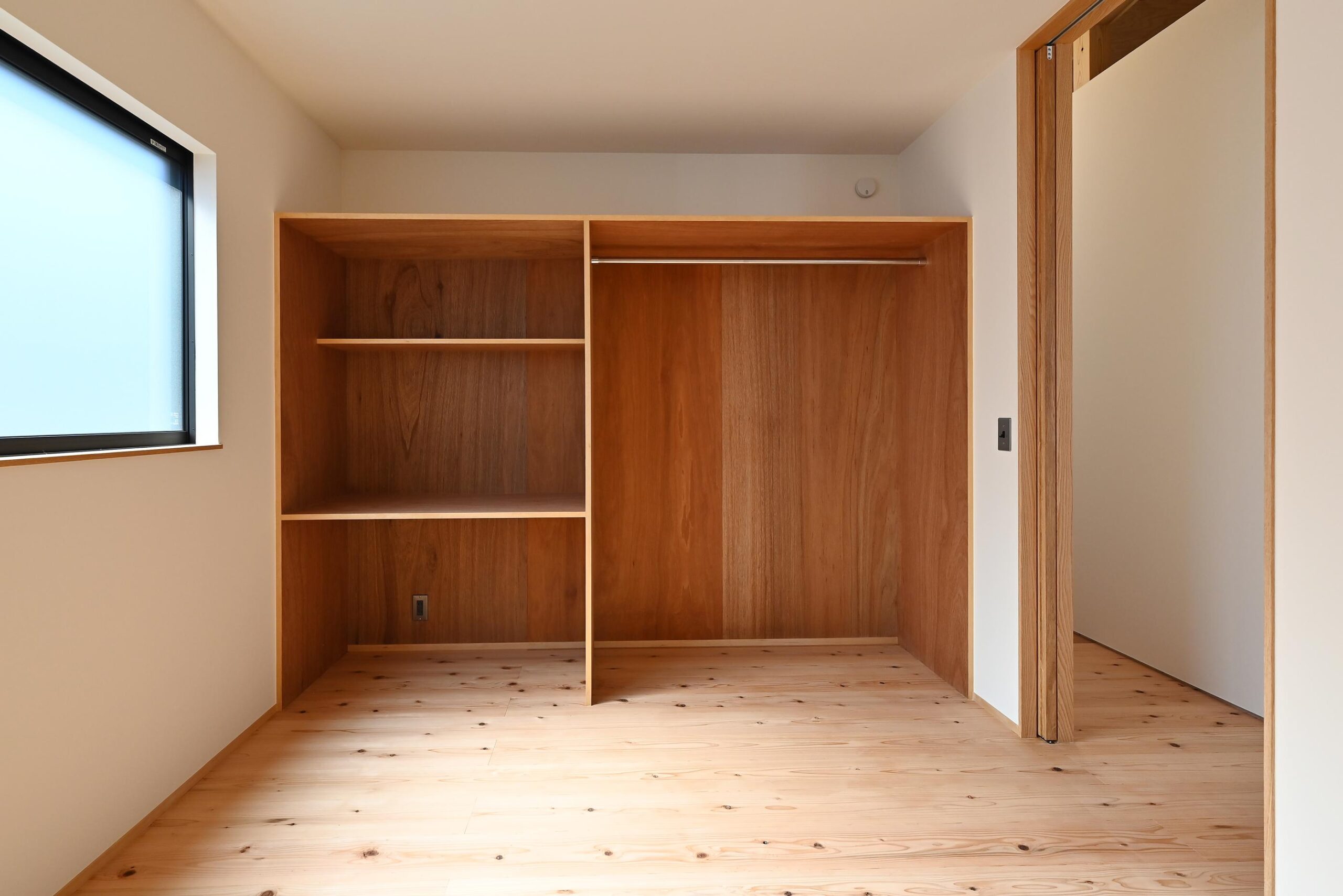 内装は、ラワン合板やラーチ合板を、床には日光杉を使用。木の温もりと洗練された空間が調和します。リビングに隣接する小上がりの畳スペースは、多目的に使える安らぎの場。北側の天窓から差し込む安定した光が、住まい全体を包み込みます。そして、リビングから繋がる広々としたウッドデッキは、内外を繋ぐもう一つの開放的な空間です。