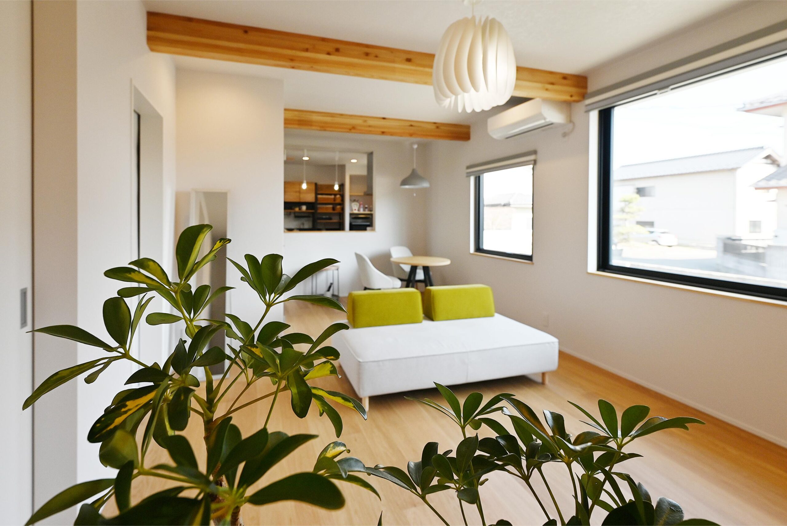 ホテルのように整理整頓されて、清々しいLDK。腰窓にして気軽にカーテンが開けられるようになったそうです。