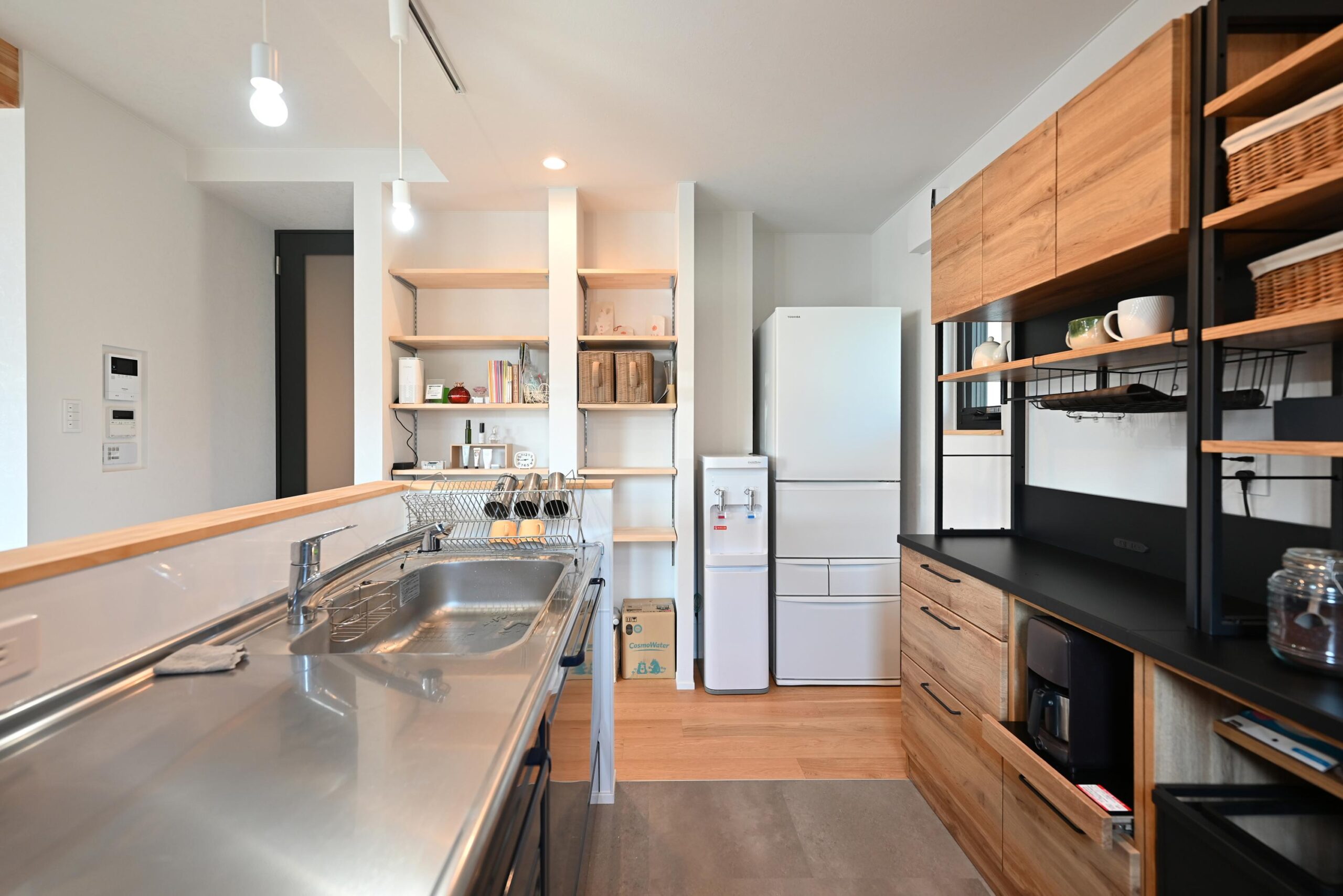 キッチンの背面収納は既製品を上手に合わせてコストダウン。