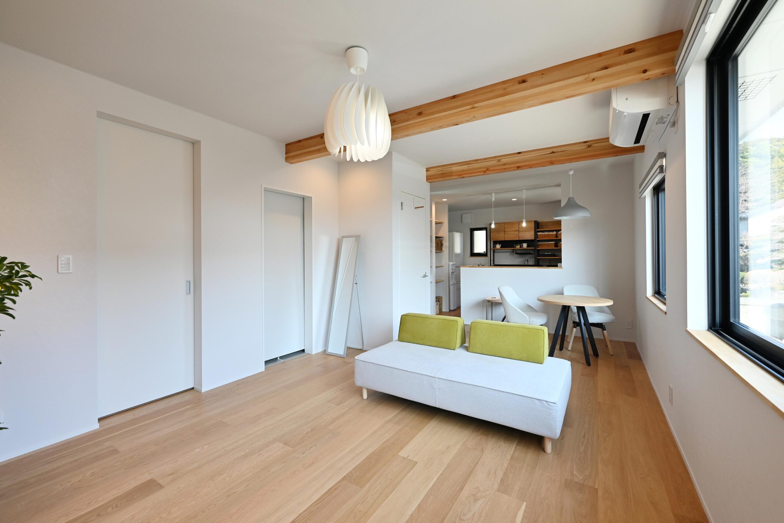 ホテルのように整理整頓されて、清々しいLDK。腰窓にして気軽にカーテンが開けられるようになったそうです。