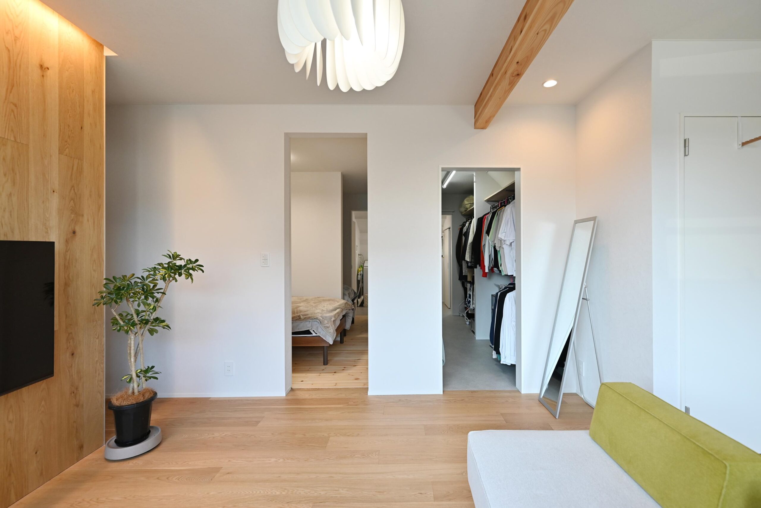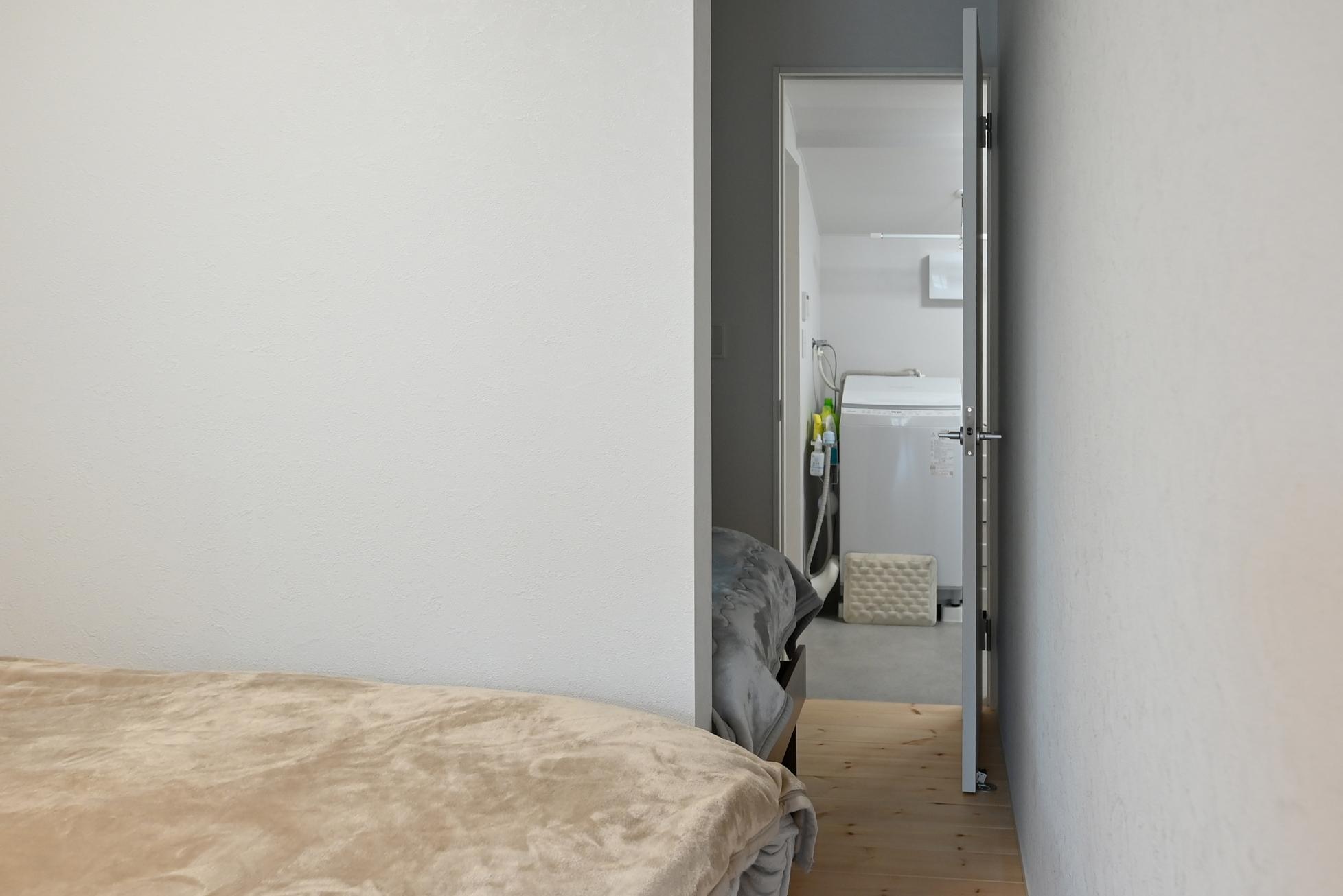 寝室の「技あり!」はご夫婦のベッドの間仕切壁。もしものために気配を感じつつ、お互いの時間を気にせず就寝できる工夫。ランドリーへも直結。