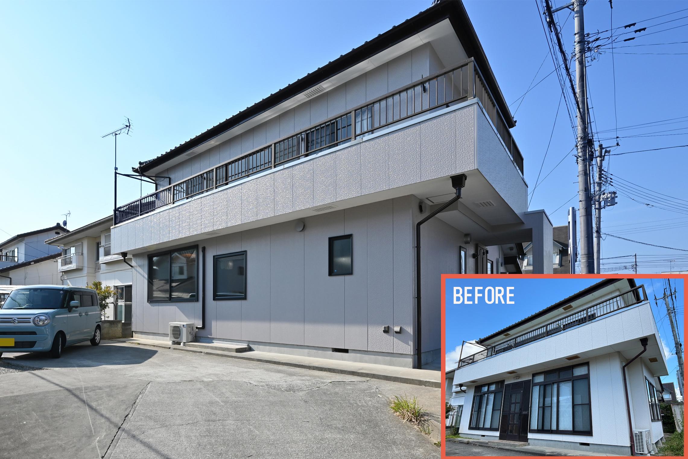 以前は典型的な昭和な間取り&外観でした。中央に玄関があり、左右に部屋が分かれていて北側に水周り、廊下が多く細かく仕切られていました。将来的に1階をワンルームのように暮らした方が便利で楽という提案で、玄関を東側に移動、掃き出し窓も腰窓に。
