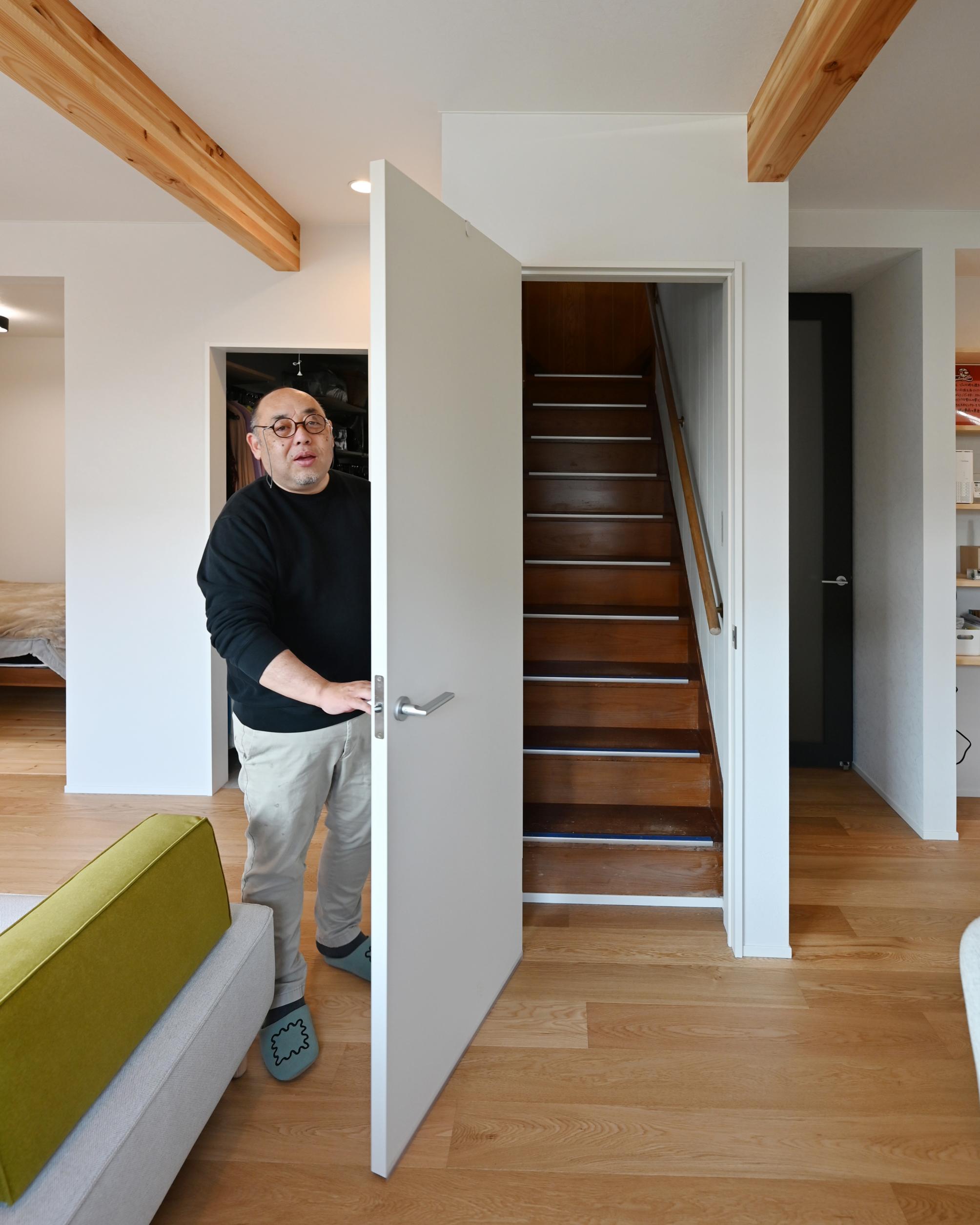 「ドアの向こうは寒さが魔界」と奥様。階段から上は既存のまま手を加えず、このドアで断熱を区切っています&魔界の番人のような後田社長。