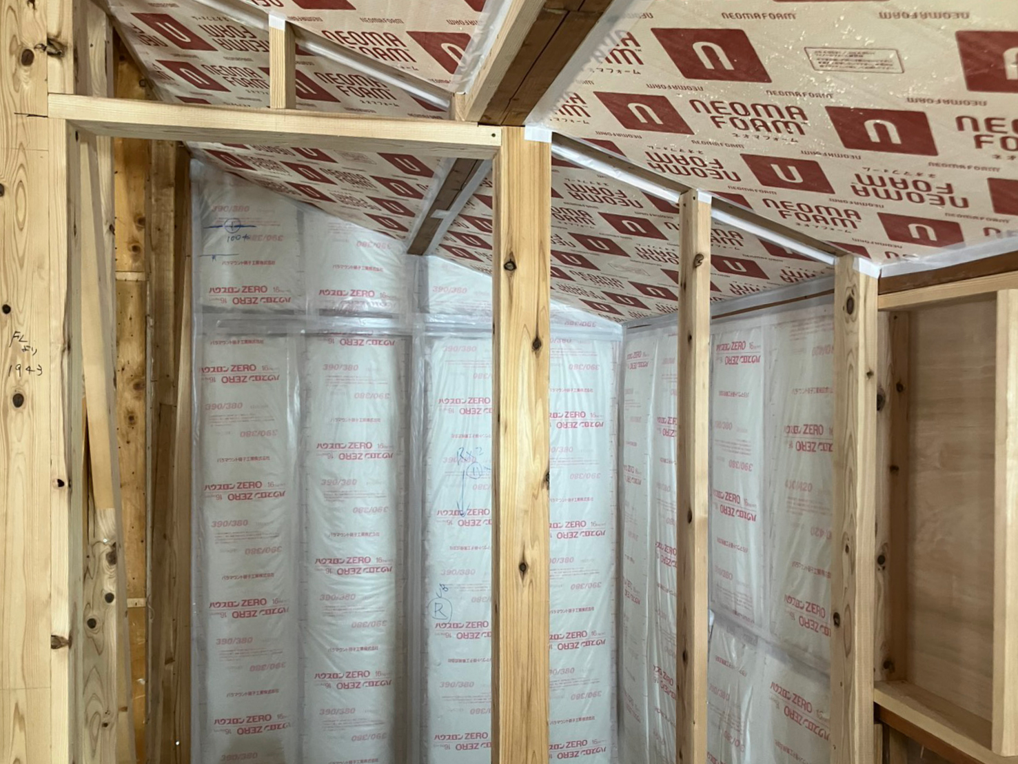 天井:高性能グラスウール16k t=155mm、ネオマフォーム t=60mm